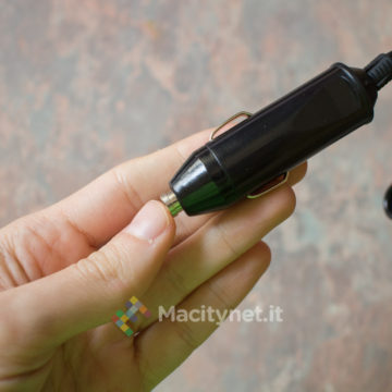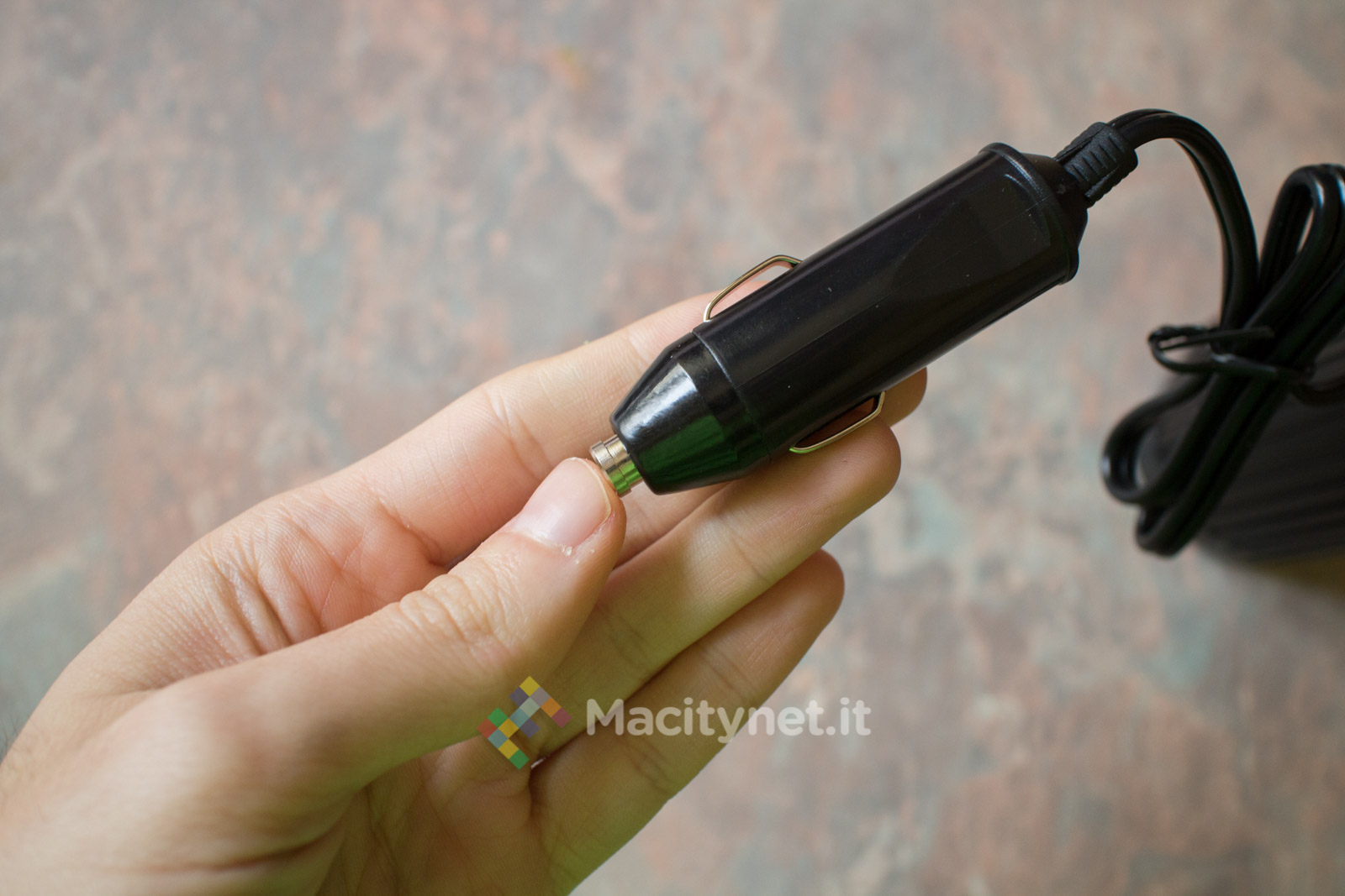 Sul lato superiore è infine incassato il cavo, lungo intorno ai 43 centimetri, al termine del quale è agganciata la spina accendisigari.