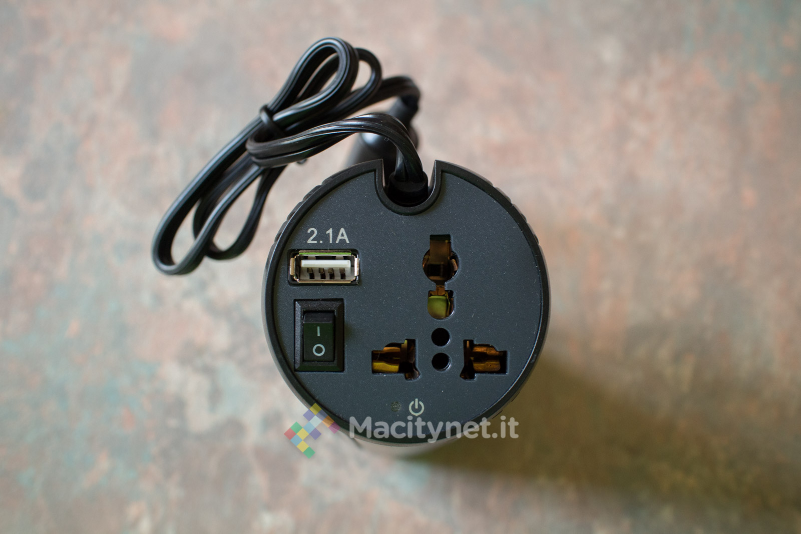 Sul lato superiore trovano posto un interruttore ON/OFF, una presa USB-A da 2.1 A ed una presa elettrica AC di tipo universale con i contatti forse un po’ troppo esposti, dove possono essere quindi collegati facilmente prodotti con spina italiana, europea, americana, australiana e del Regno Unito. Mentre questa porzione del caricatore e la base sono realizzate in materiale plastico molto solido e robusto, il resto del corpo del caricatore è costruito da un tubo cilindrico in alluminio spazzolato, certamente migliore nella dissipazione del calore.