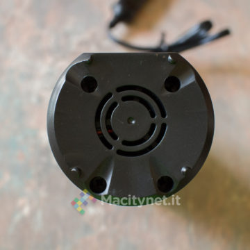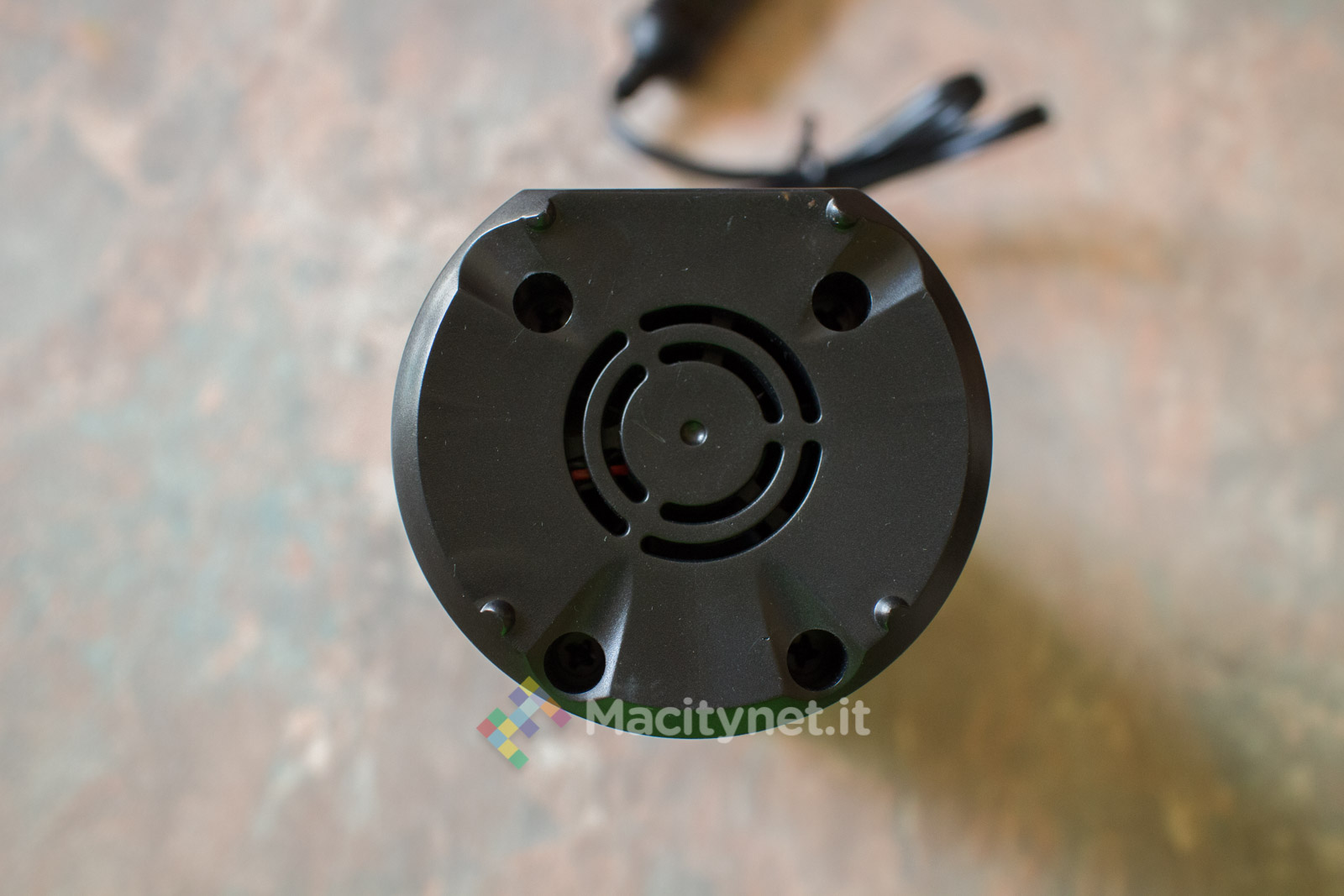 Questo posizionamento può in effetti risultare più congeniale in estate o quando l’alimentatore viene sottoposto a forte stress, come per l’appunto quello di un utilizzo intenso con un prodotto che richiede un numero elevato di Watt, in quanto è proprio alla base del cilindro che un’apertura favorisce la fuoriuscita del calore attraverso una piccola ventola. Il fondo, come dimostrano le immagini, è concavo e leggermente sollevato da terra grazie ad alcuni piccoli piedini, così anche in posizione verticale offre comunque un minimo di esposizione all’aria quando lo si appoggia nel portabicchieri.