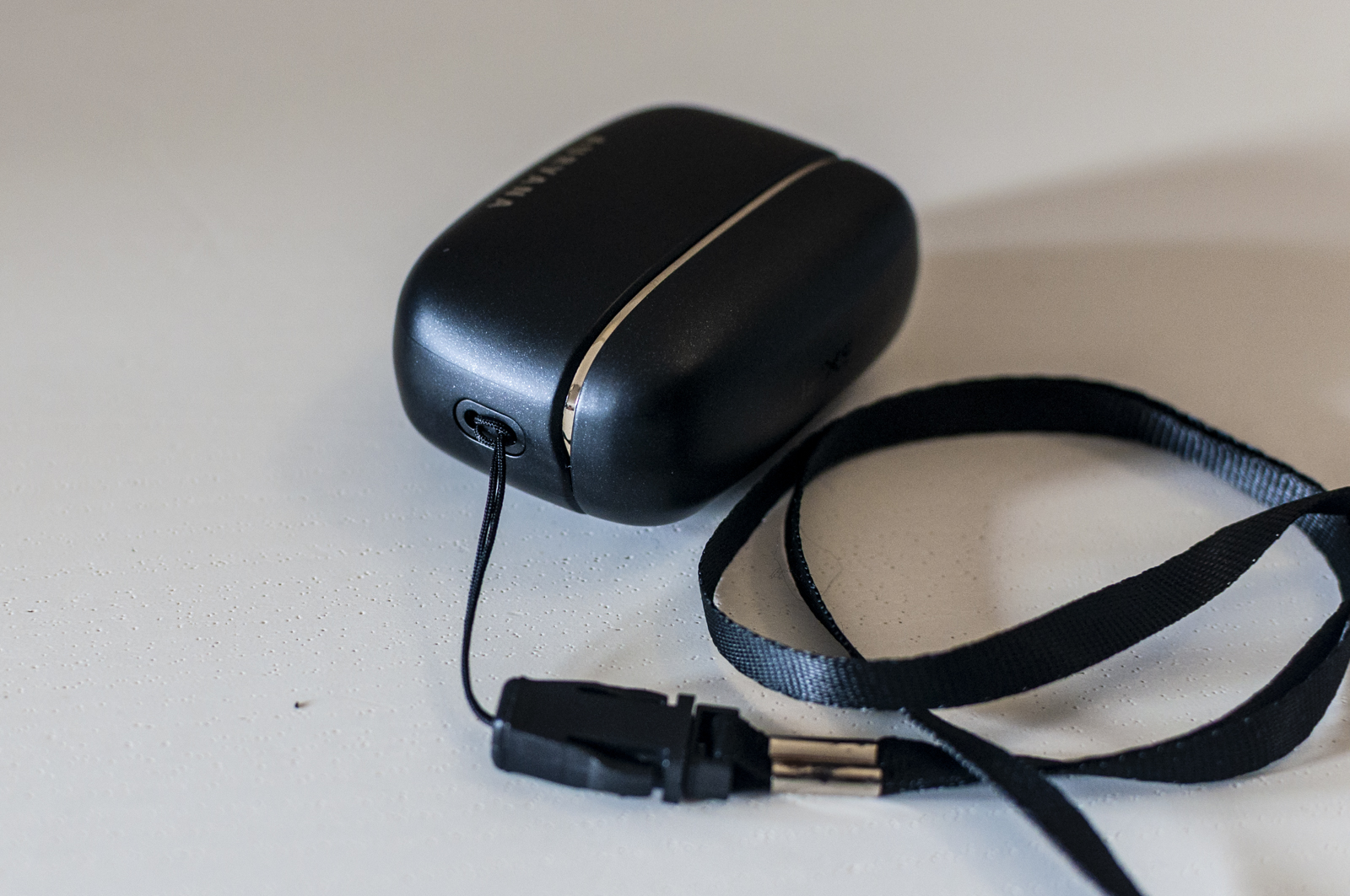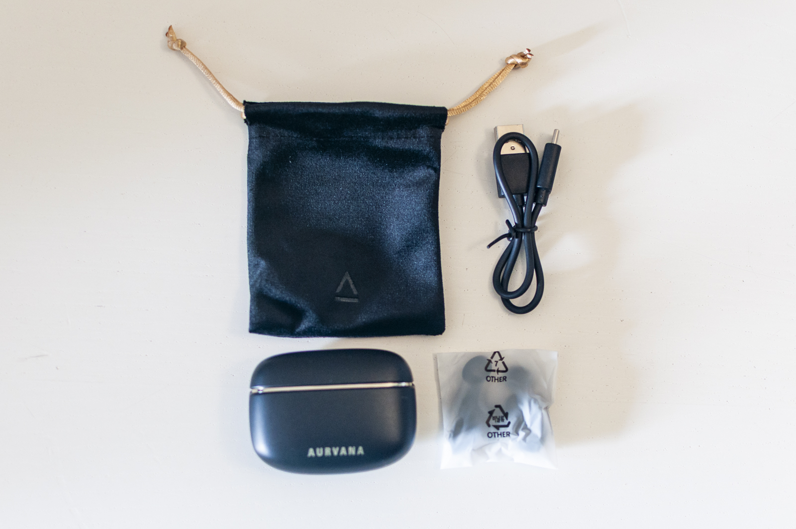 La culla misura 65,5 x 48,9 x 30 mm per un peso di 49,7 g (6 g per auricolare): è realizzata in poliestere di colore scuro opaco, quasi nero, dolce al tatto e con il logo AURVANA stampato nella parte frontale. Una fessura di materiale lucido metallizzato chiaro cintura la culla nella parte frontale e permette una più facile apertura del tappo, con il materiale lucido che permea tutto l’interno dove sono posizionati gli auricolari veri e propri.