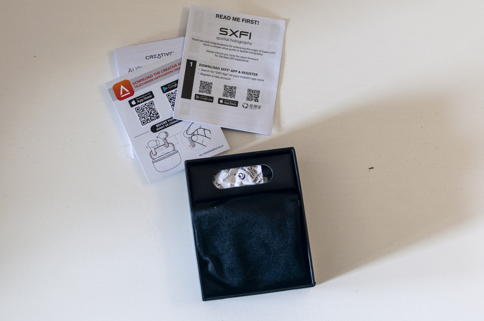 La confezione che arriva è in cartone, ben curata graficamente, con la foto in vernice lucida su carta opaca. Al suo interno trovano posto alcuni fogli informativi e la culla degli auricolari veri e propri, protetta da uno sfizioso sacchetto in velluto nero, oltre al cavo di ricarica USB-A/USB-C e un altro sacchetto in plastica morbida con i ricambi per i gommini.