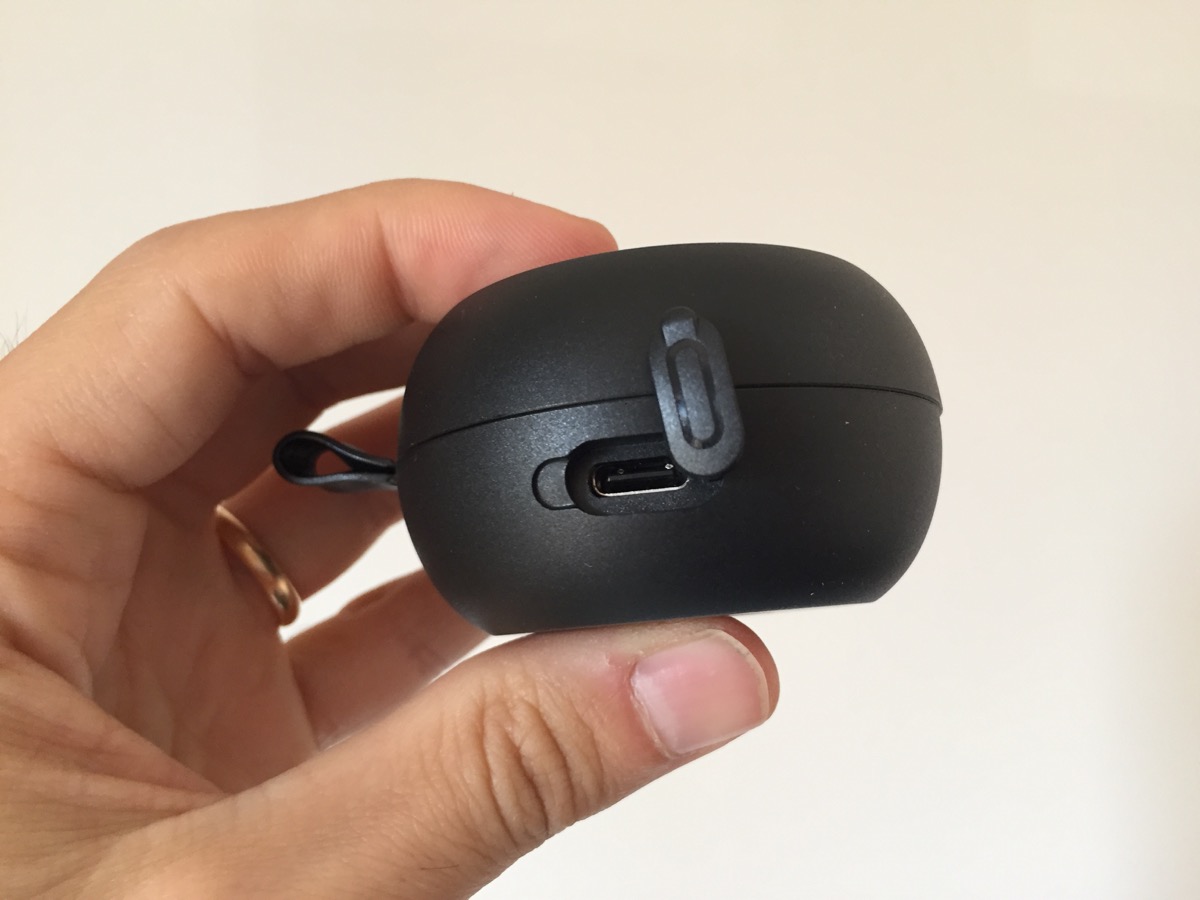 Per ricaricare il tutto basta aprire il coperchio laterale e collegarci la spina USB-C del cavetto in dotazione o di uno degli altri che abbiamo in casa. Con un alimentatore da 5V la batteria viene ripristinata in un’ora e mezza, mentre poco meno serve per ricaricare i singoli auricolari completamente scarichi quando li inseriamo nella custodia.