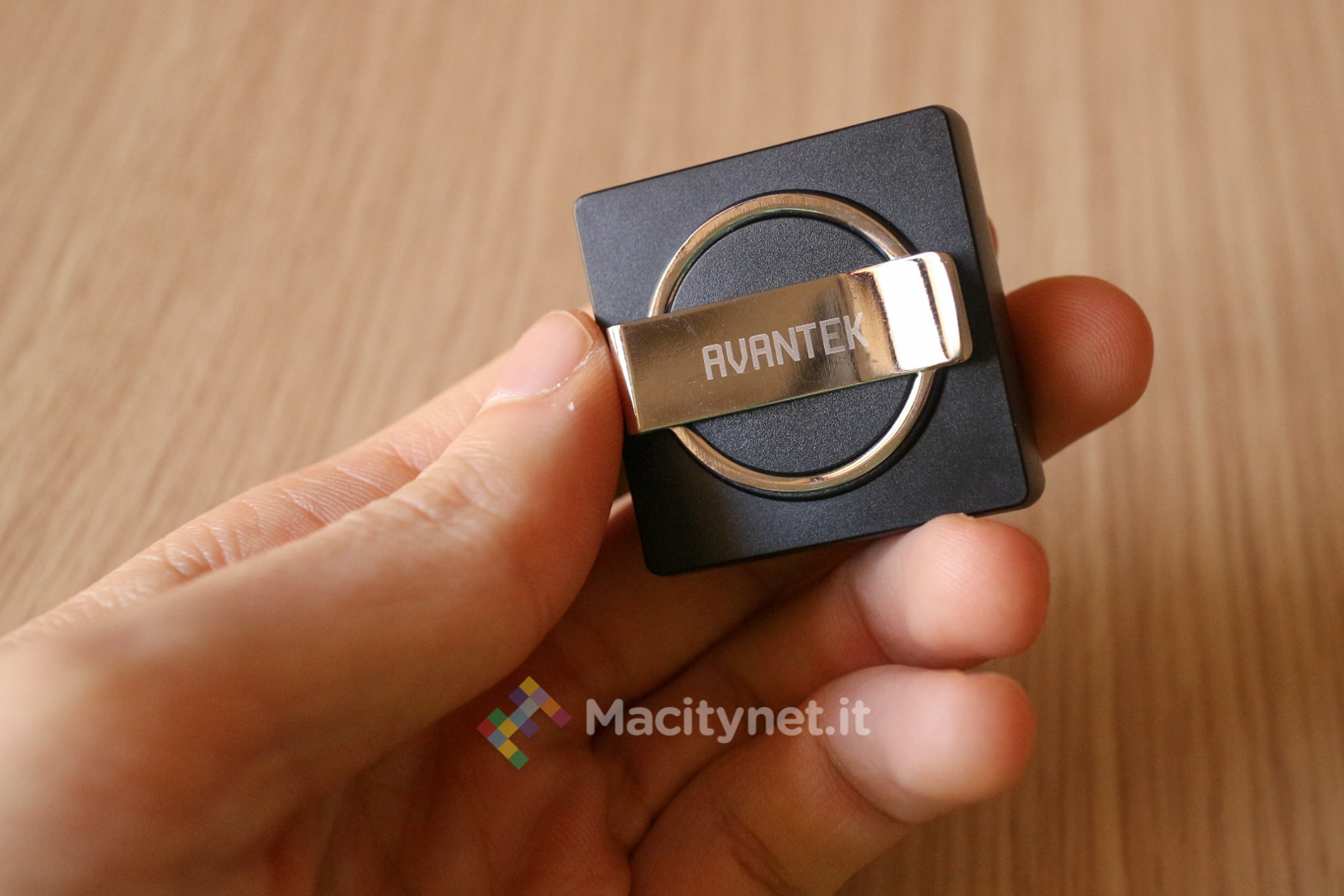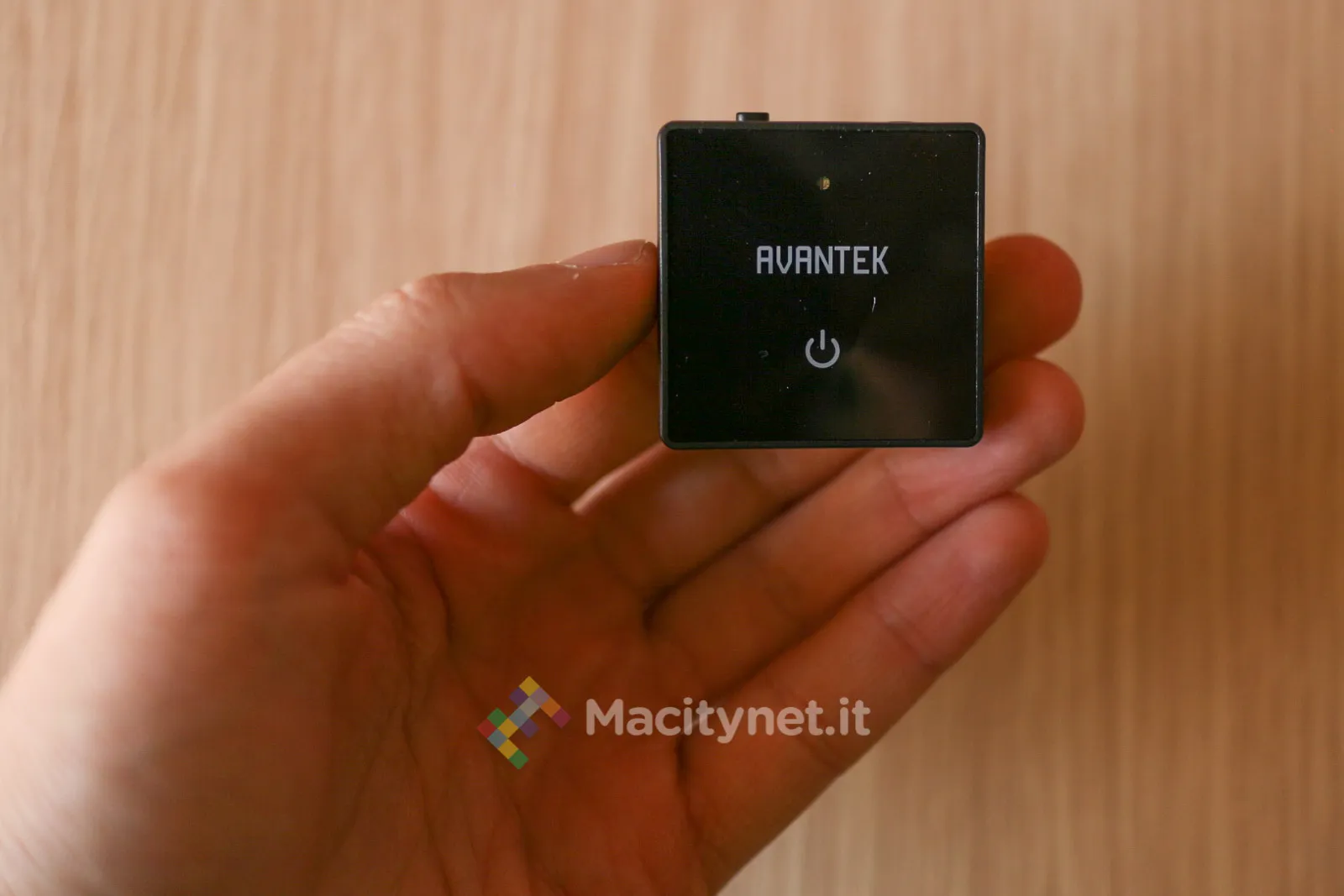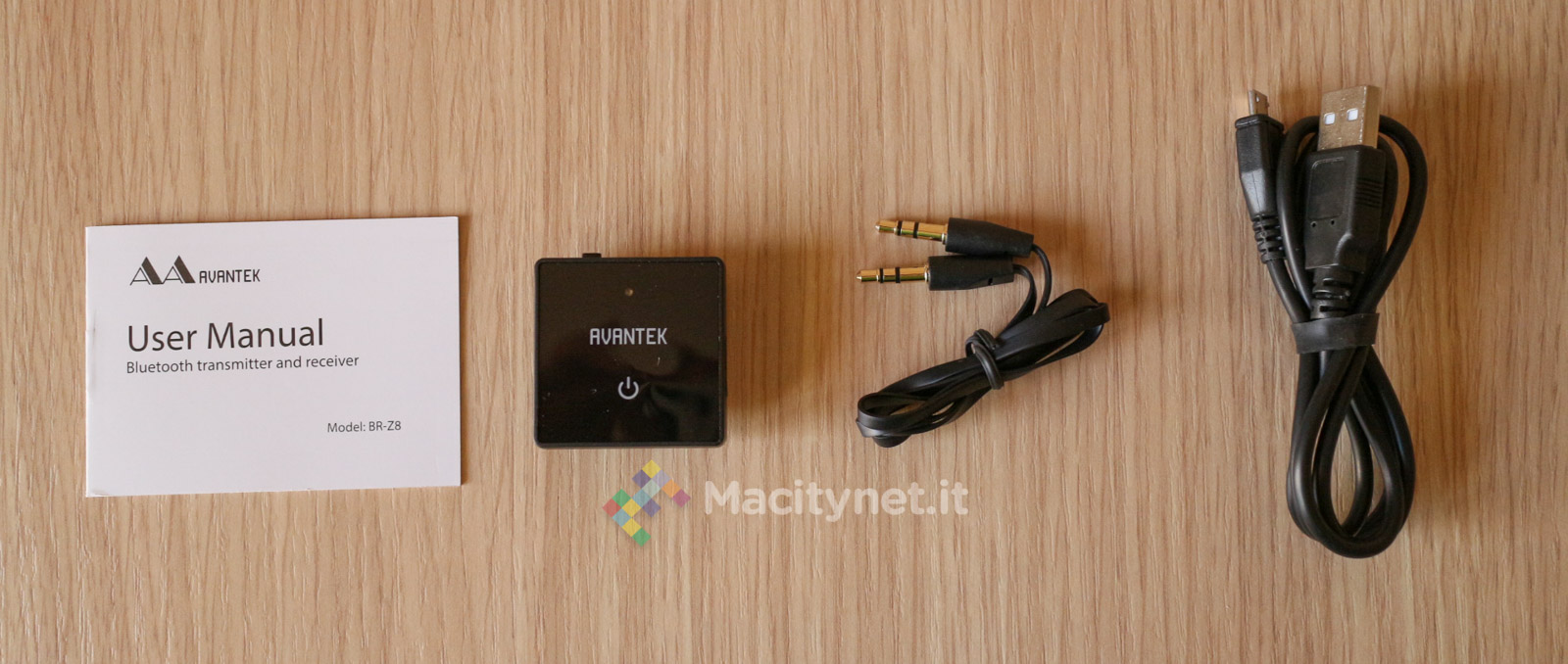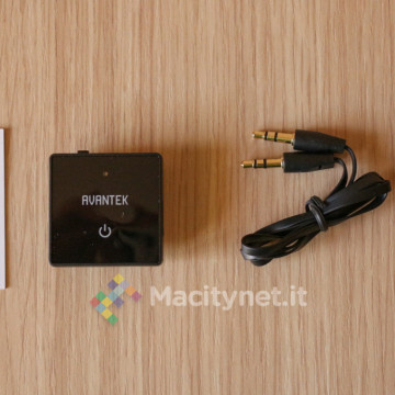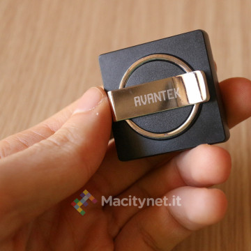 E’ quest’ultimo il caso di Avantek BR-Z8, un piccolo accessorio dala forma quadrata che può ricoprire entrambi i ruoli dimostrandosi utile nelle situazioni più disparate. Misura 3,6 x 3,6 x 1 centimetri e pesa appena 15 grammi, ha un pulsante ON/OFF nascosto sul lato frontale ed un interruttore RX/TX su un bordo, affiancato dall’ingresso jack da 3,5 mm. Da un altro lato troviamo l’ingresso microUSB per la ricarica e l’unica reale particolarità che lo distingue da dispositivi simili sta nella presenza di una clip, in metallo, che ne facilita l’aggancio a taschino e cintura.