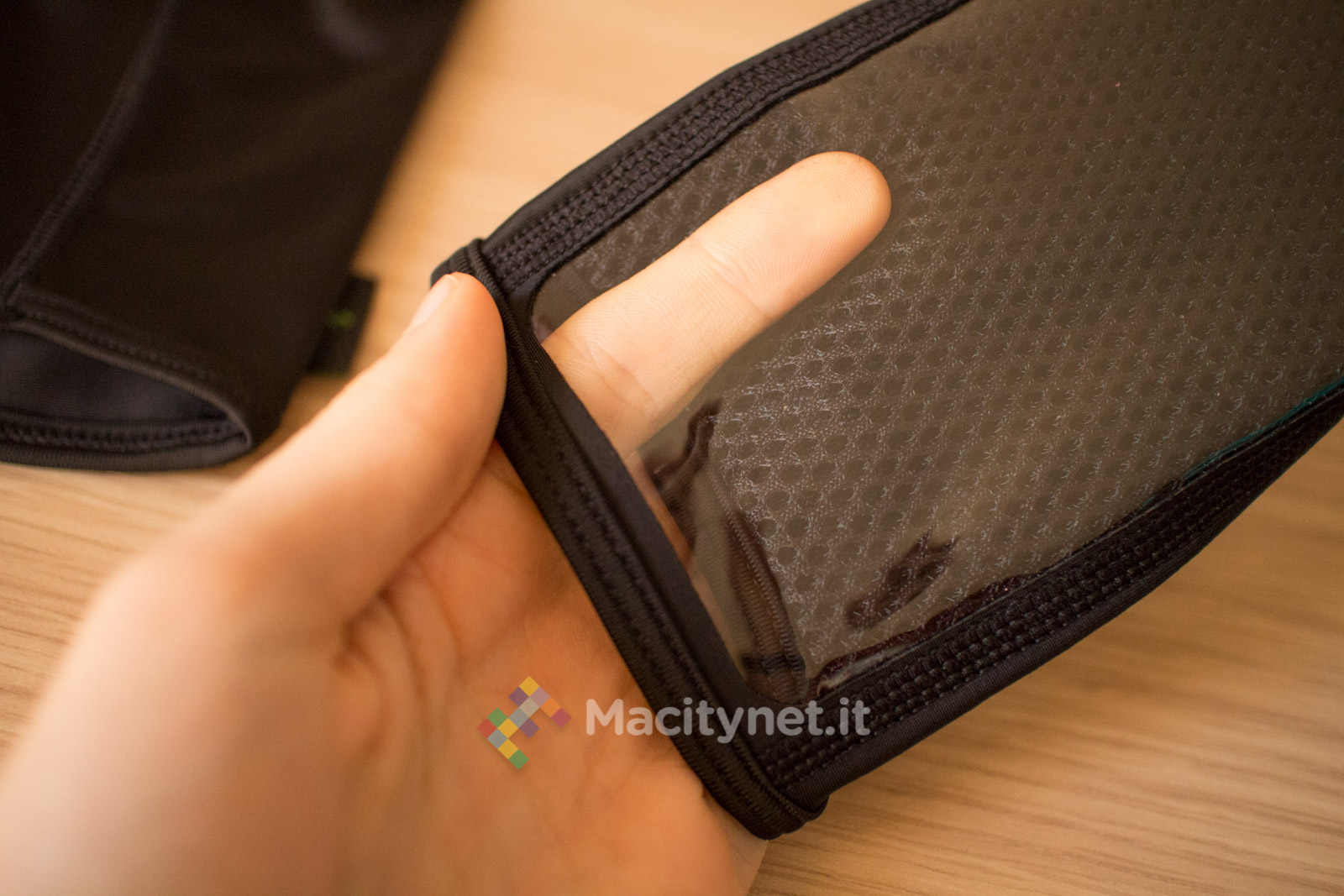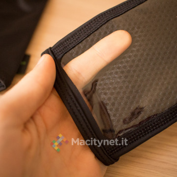 Come anticipato il vantaggio principale rispetto ad una fascia da braccio sta nella possibilità di interagire con lo smartphone senza doverlo rimuovere dalla polsiera: la copertina in PVC garantisce un’ottima interazione con il touchscreen, anche se chi utilizza uno smartphone di nuova generazione sarà costretto a sfilarlo per accedere al sensore per le impronte digitali. I tasti laterali, seppur coperti, restano comunque accessibili in quanto lo strato di tessuto è comunque molto sottile e permette di “percepire” la loro posizione al tatto.