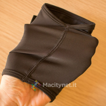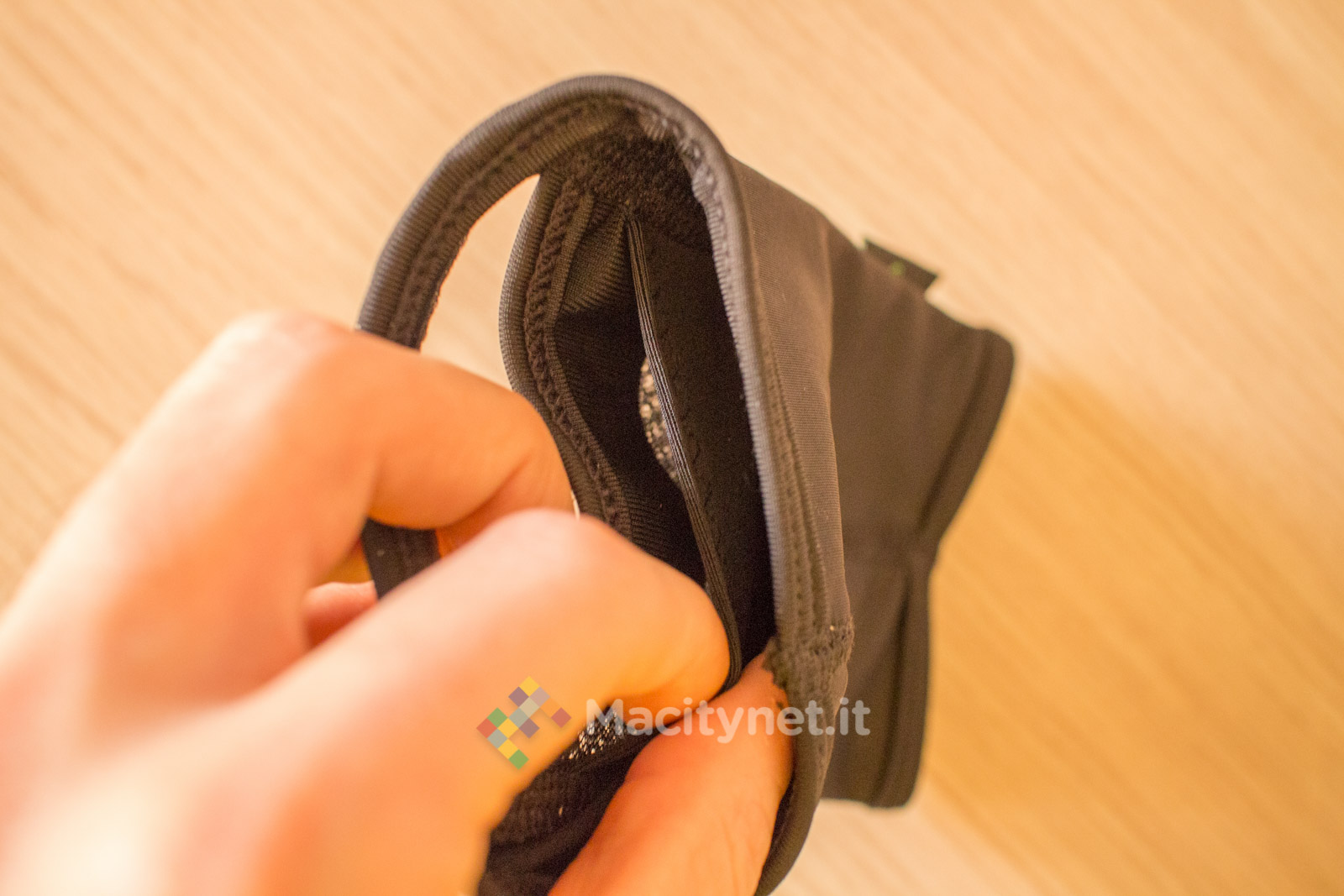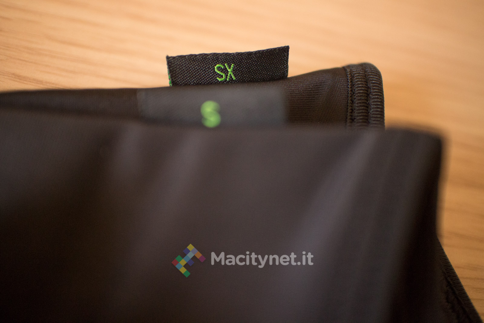 La fascia calza molto bene, non scivola neanche quando l’avambraccio è completamente sudato, inoltre non stringe pur mantenendo un’elevata aderenza grazie all’ottima elasticità del tessuto. A nostro avviso è anche abbastanza traspirante, quantomeno nel lato dove non vi è riposto lo smartphone e, come scoperto fin da subito, è idrorepellente, asciugandosi in un baleno dopo il primo lavaggio nonostante ci troviamo in pieno inverno.