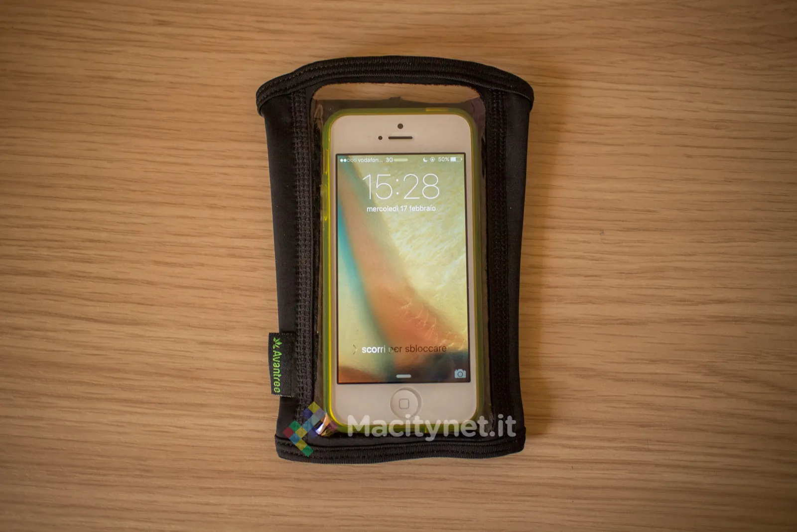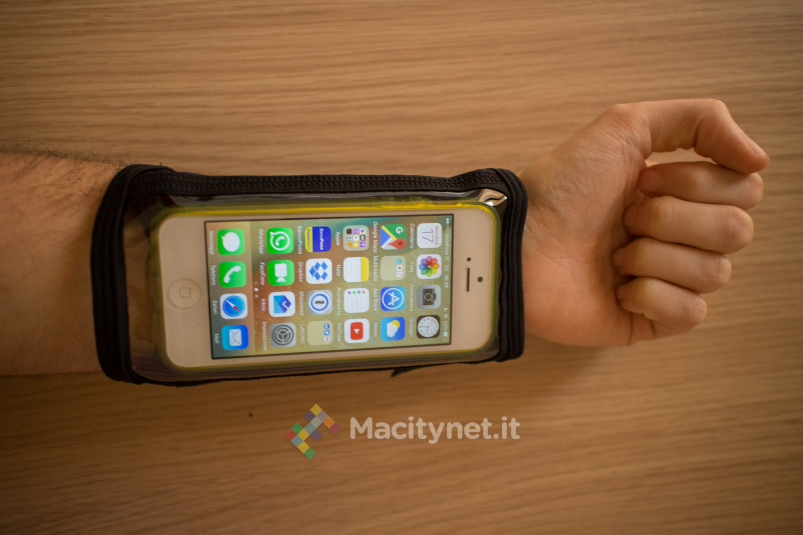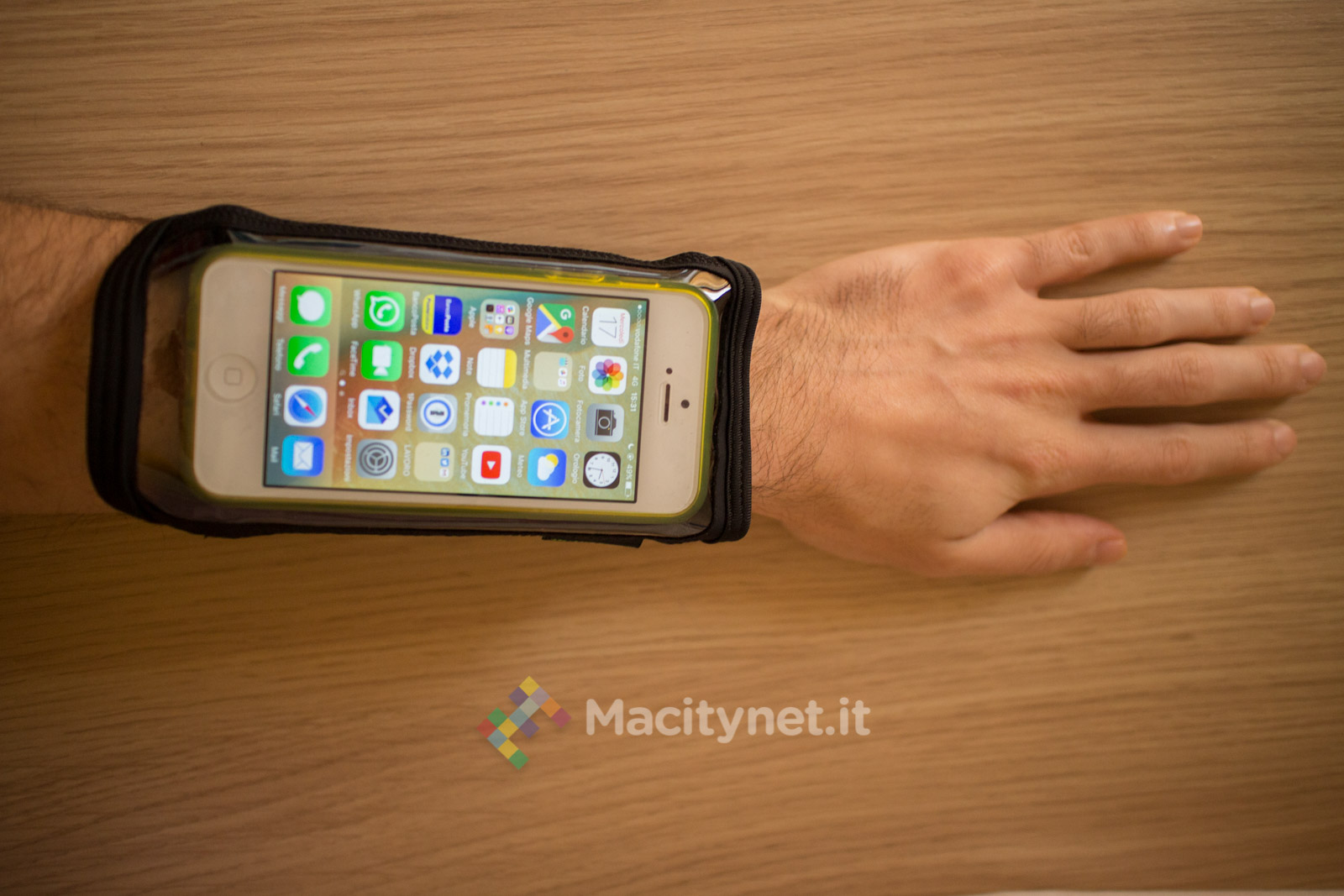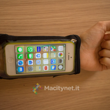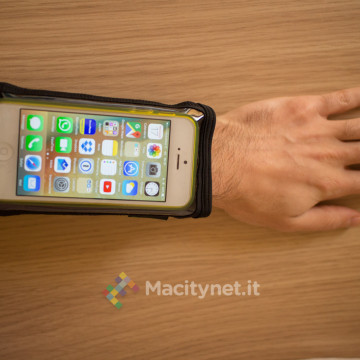 La polsiera è in grado di accogliere smartphone con display fino a 4,7 pollici, quindi anche iPhone 6 e iPhone 6s trovano posto in questo accessorio. Essendo il più grande iPhone 6 Plus il nostro smartphone primario abbiamo fatto qualche prova indossando la fascia con il vecchio iPhone 5, che ha trovato posto al suo interno con tanto di custodia in silicone al seguito.