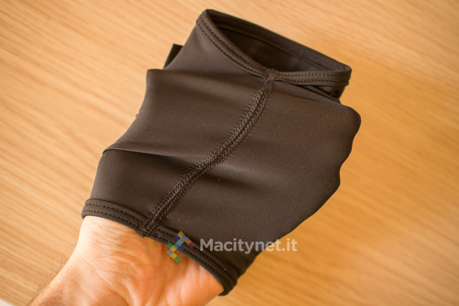 Nella confezione ci sono due polsiere di diversa dimensione, XS e S nel nostro caso, S ed M per chi dovesse optare per una versione con il diametro più largo. A parte per le diverse dimensioni, le fasce sono identiche. Sono realizzate in un unico pezzo in lycra molto elastico, morbido e fresco al tatto. Da un lato c’è uno scompartimento rivestito con una copertina in PVC trasparente utile per interagire con il dispositivo senza rimuoverlo dalla polsiera.
