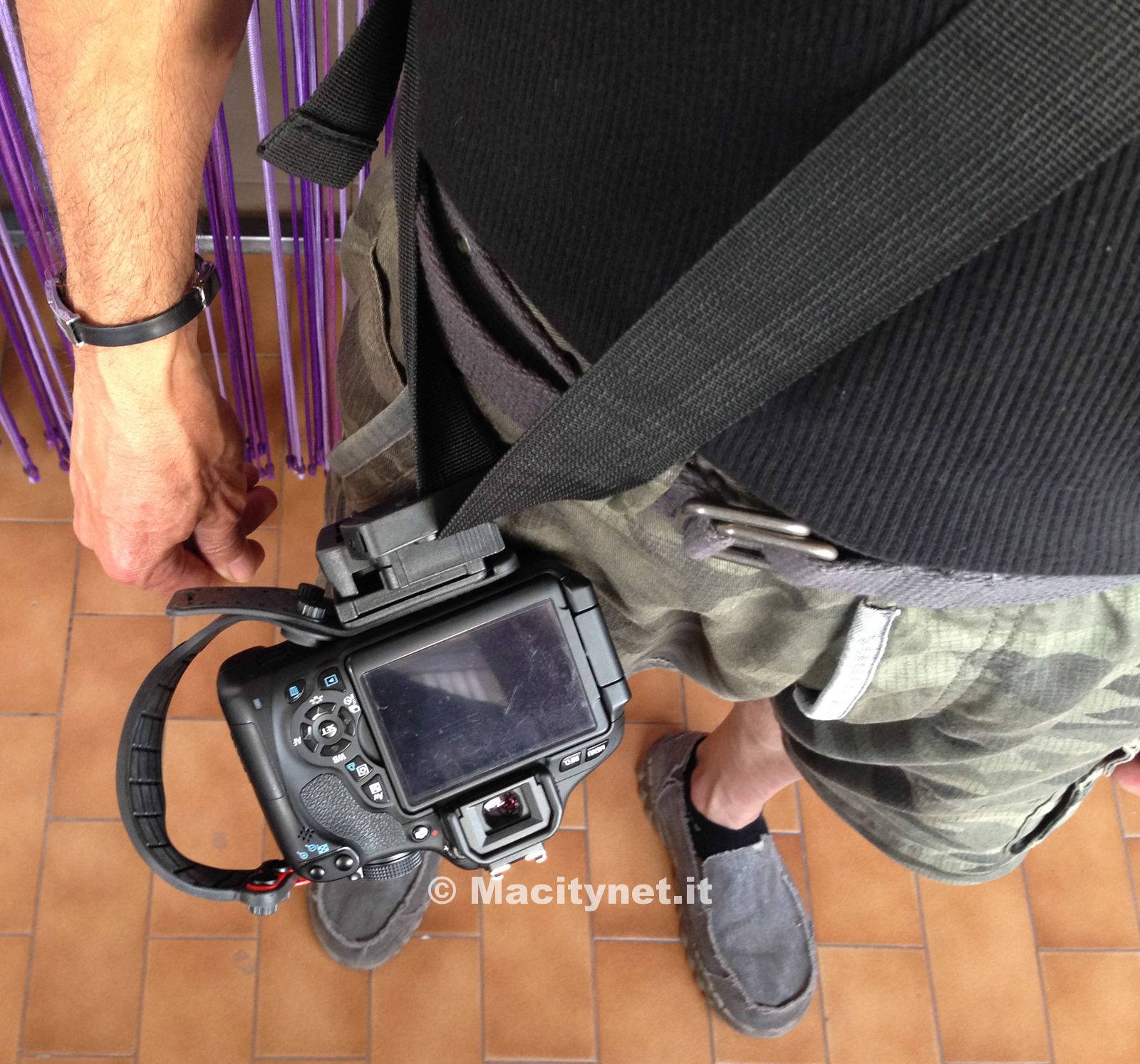 Successivamente si indossa la tracolla ed, una volta regolata alla propria corporatura, sarà sufficiente sollevare il sistema a molla, inserire la fotocamera e rilasciare la clip per bloccare la fotocamera. Quando non utilizzata, la fotocamera scenderà sul lato destro del corpo, ad altezza bacino, ed il peso graverà soltanto sulla spalla, risultando in generale minore rispetto a quando portiamo la fotocamera al collo con la classica tracolla. Tirando verso l’esterno un anello posto in prossimità della fascia morbida che aderisce alla spalla sarà possibile accorciare la tracolla per sollevare la fotocamera ad altezza costole: questa è una delle tante caratteristiche che ci sono piaciute in quanto permette, in pochi istanti, di rendere la fotocamera ferma e stabile al nostro corpo anche durante una camminata energica. Riducendo la lunghezza della tracolla infatti, i movimenti del corpo macchina saranno infatti drasticamente ridotti. Nel caso in cui si volesse scattare una foto al volo, sarà sufficiente sollevare con un dito il moschettone proprio sopra l’anello per lasciar scivolare via la tracolla riportandola alla lunghezza originale.