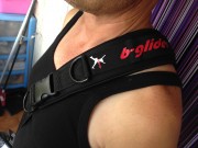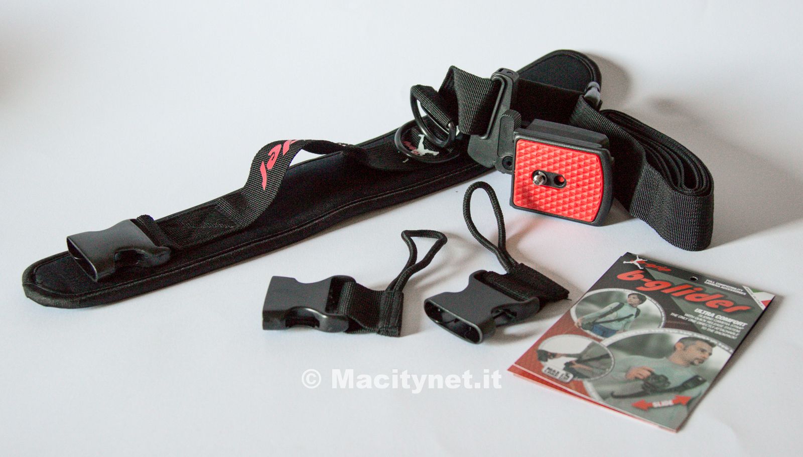 Il secondo accessorio facoltativo è l’HS, hand strap, una fascia che si fissa alla reflex e ne migliora l’impugnatura sia durante l’utilizzo della b-glider che a mano libera. Totalmente in gomma, un lembo si fissa al gancio destro della reflex, quello dove solitamente viene agganciata la tracolla classica, mentre l’altro si incastra tra la base della reflex e la piastra. Seppur non fondamentale, rende più salda l’impugnatura della reflex e la assicura alla nostra mano nel caso in cui volessimo utilizzarla senza la tracolla.