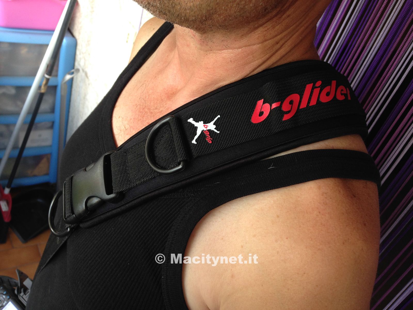 Un’altra caratteristica apprezzata è la possibilità di sfruttare la tracolla anche nel caso in cui si utilizzi uno zaino: nella confezione sono infatti inclusi anche le due femmine dei moschettoni che possono essere fissate allo zaino sempre in spalla. In questo caso la fascia morbida può essere del tutto rimossa per agganciare il resto del b-glider a queste due componenti opportunamente fissate allo zaino ed evitare il fastidio che potrebbe presentarsi indossando contemporaneamente sia la tracolla che lo zaino.