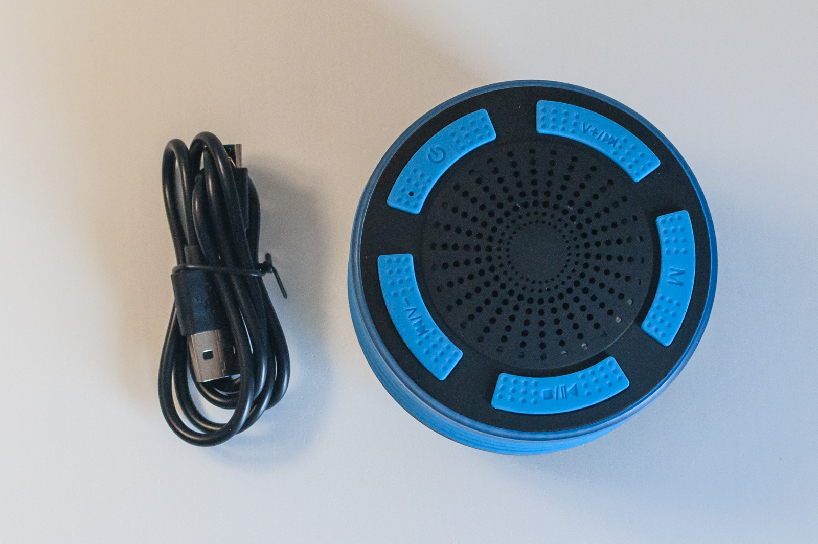 La prima cosa che si nota è che il piccolo diffusore ha un look abbastanza appariscente, con l’abbinamento nero/azzurro a cui è accompagnata una non differente “sfilata” di luci multicolore che sotto la doccia o in giardino di sera fanno comodo.
