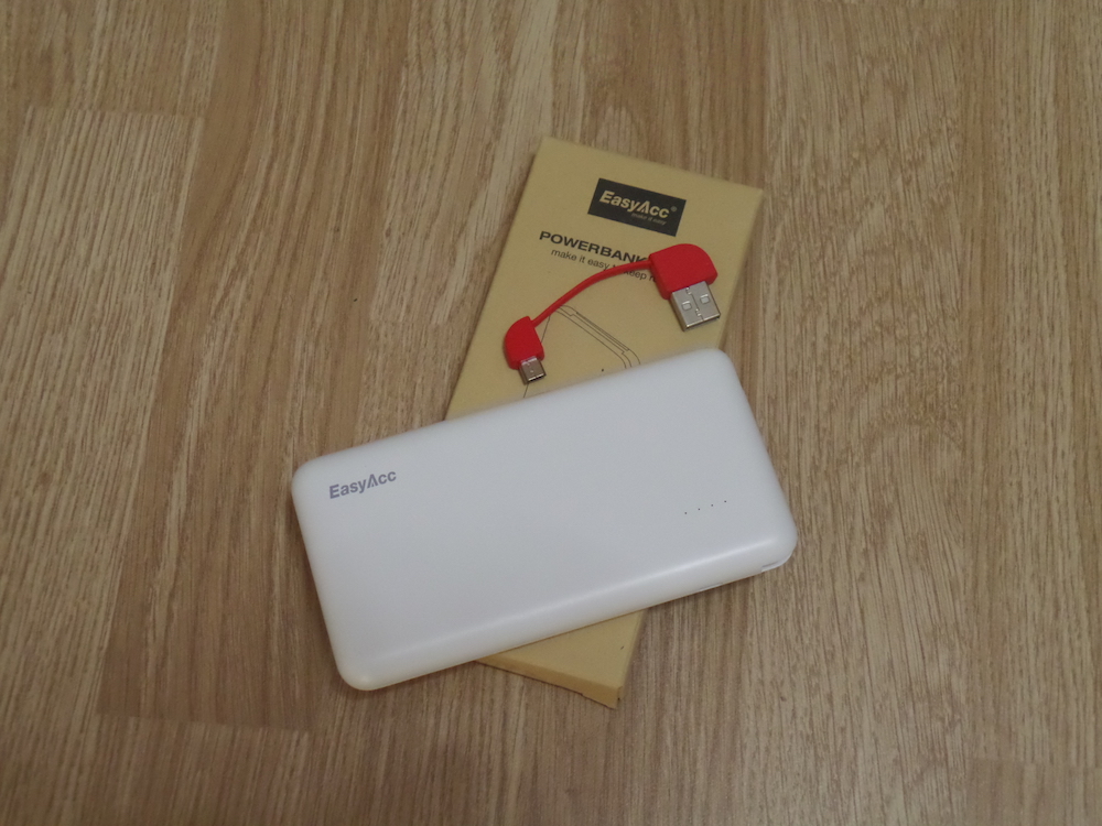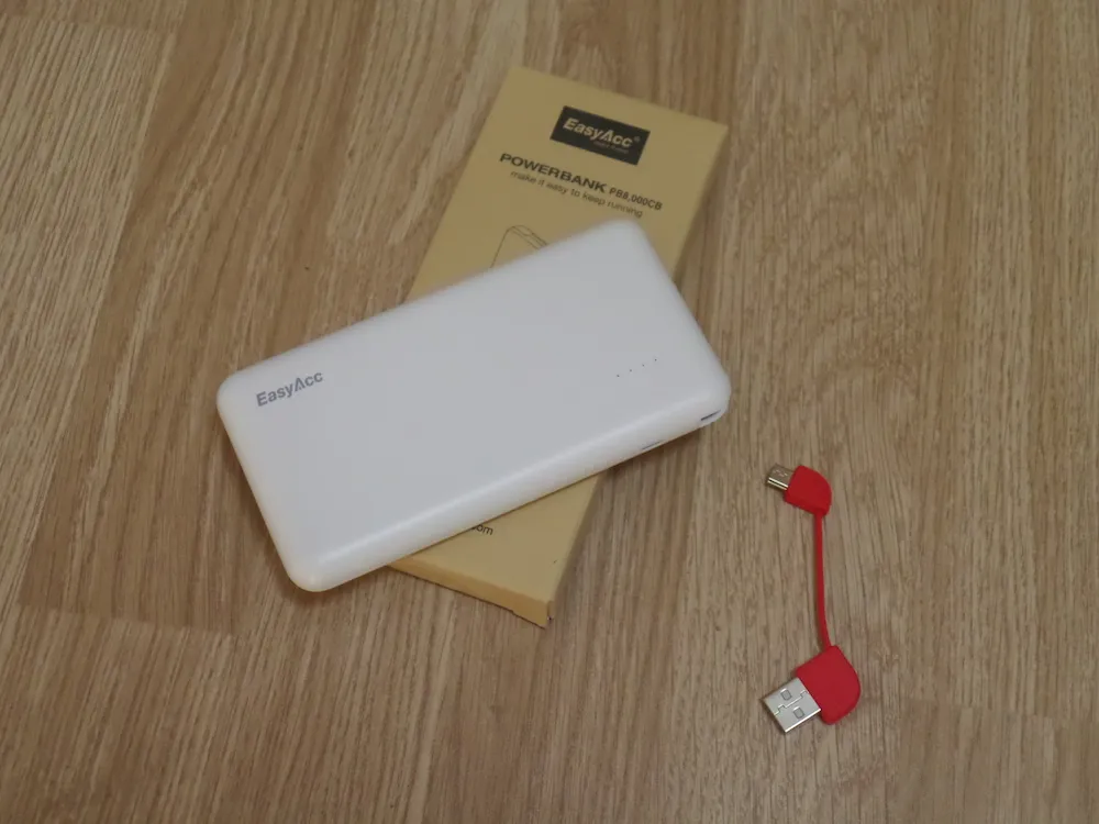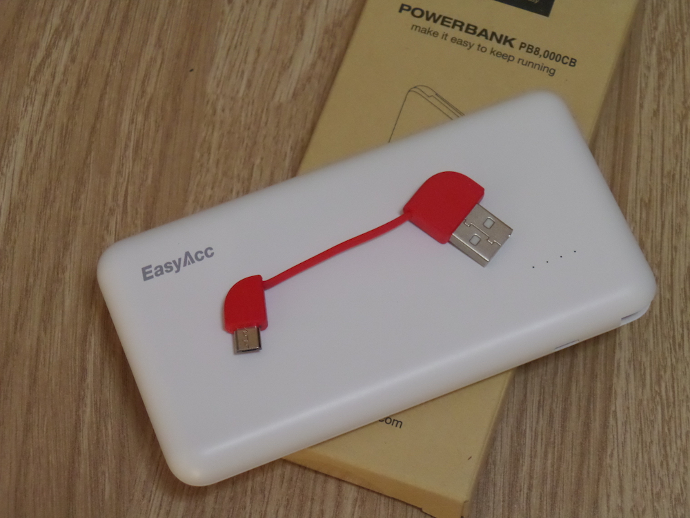 La powerbank EasyAcc da 8000 mAh con cavo incorporato presenta un design tra i più puliti ed eleganti, ma la principale caratteristica è proprio la presenza di un piccolo cavo USB-MicroUSB che si integra sulla scocca superiore della batteria. Questo elimina la possibilità di dimenticare il cavo a casa, ma la lunghezza dello stesso impedisce di utilizzare comodamente il terminale quando è in ricarica.