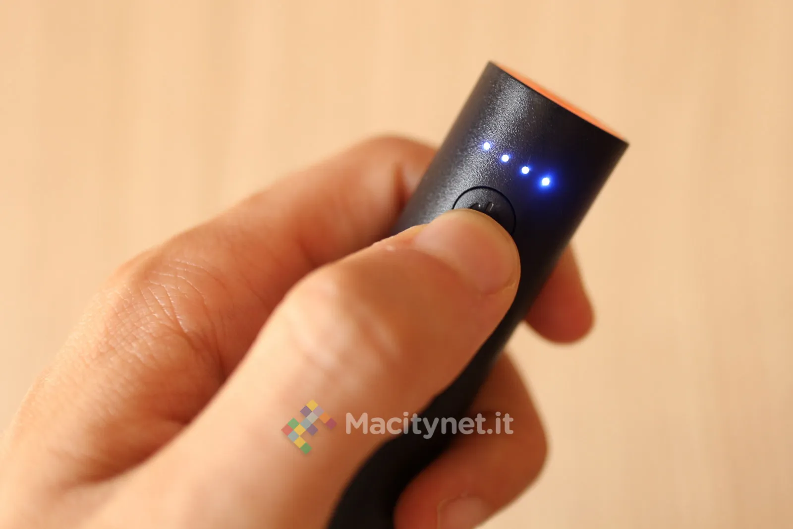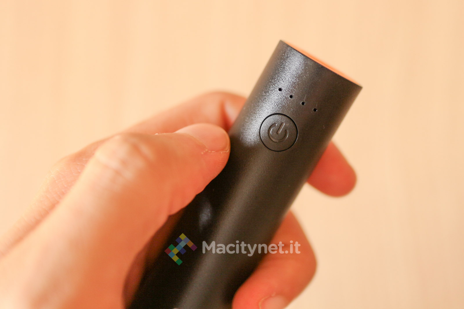Un solo pulsante, su un lato del tubo, accende i 4 LED utili per scoprire di quanta energia dispone ancora la batteria (ciascuno indica il 25%). A differenza di qualche altro modello simile non ha la funzione di torcia, è pensata soltanto per ricaricare i telefoni e non deve essere neanche accesa per funzionare visto che, non appena si collega il telefono con il cavetto (per telefoni Android e Windows Phone si può anche sfruttare il cavo microUSB incluso nella confezione), la batteria si accende automaticamente iniziando subito la ricarica.