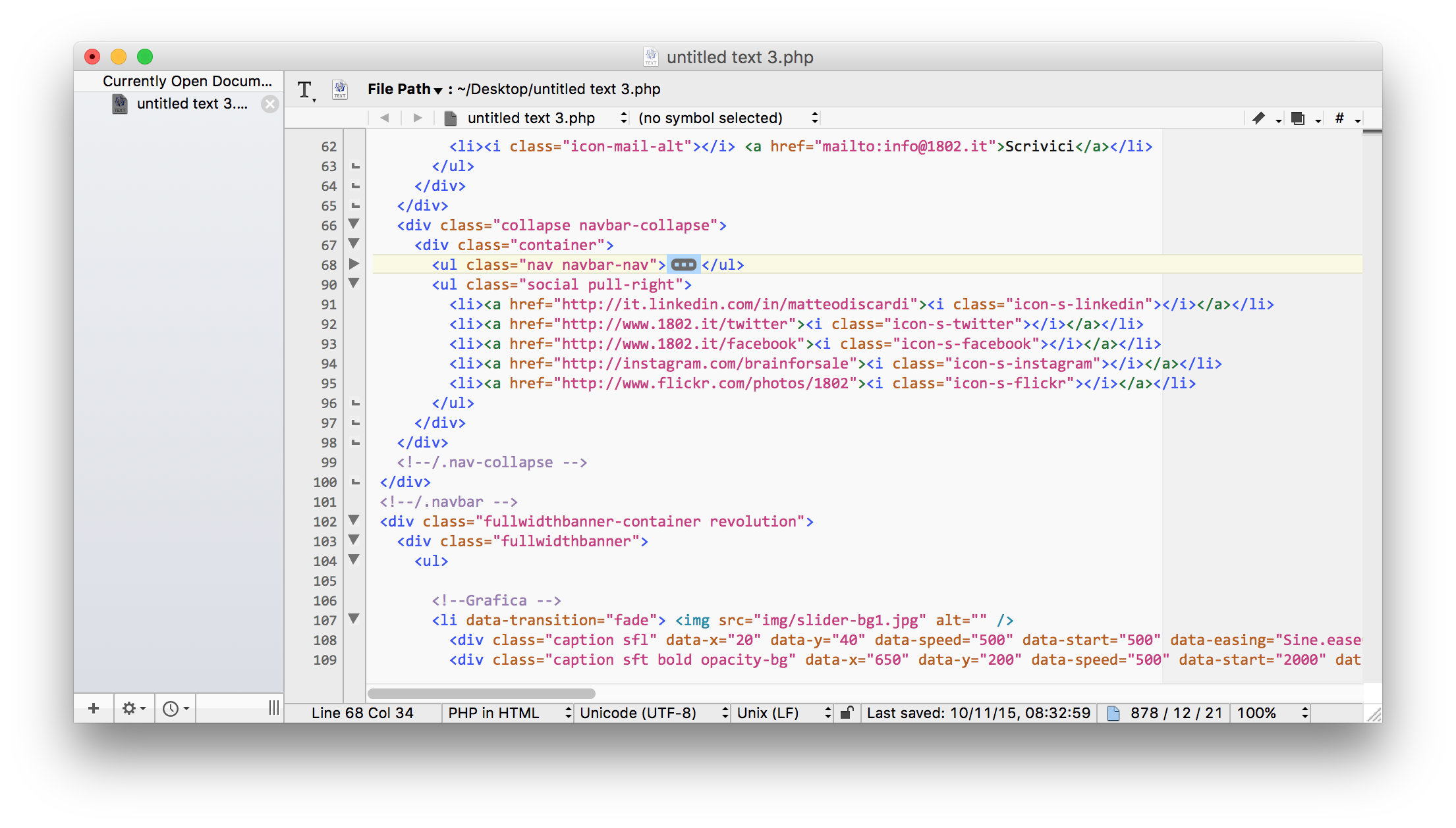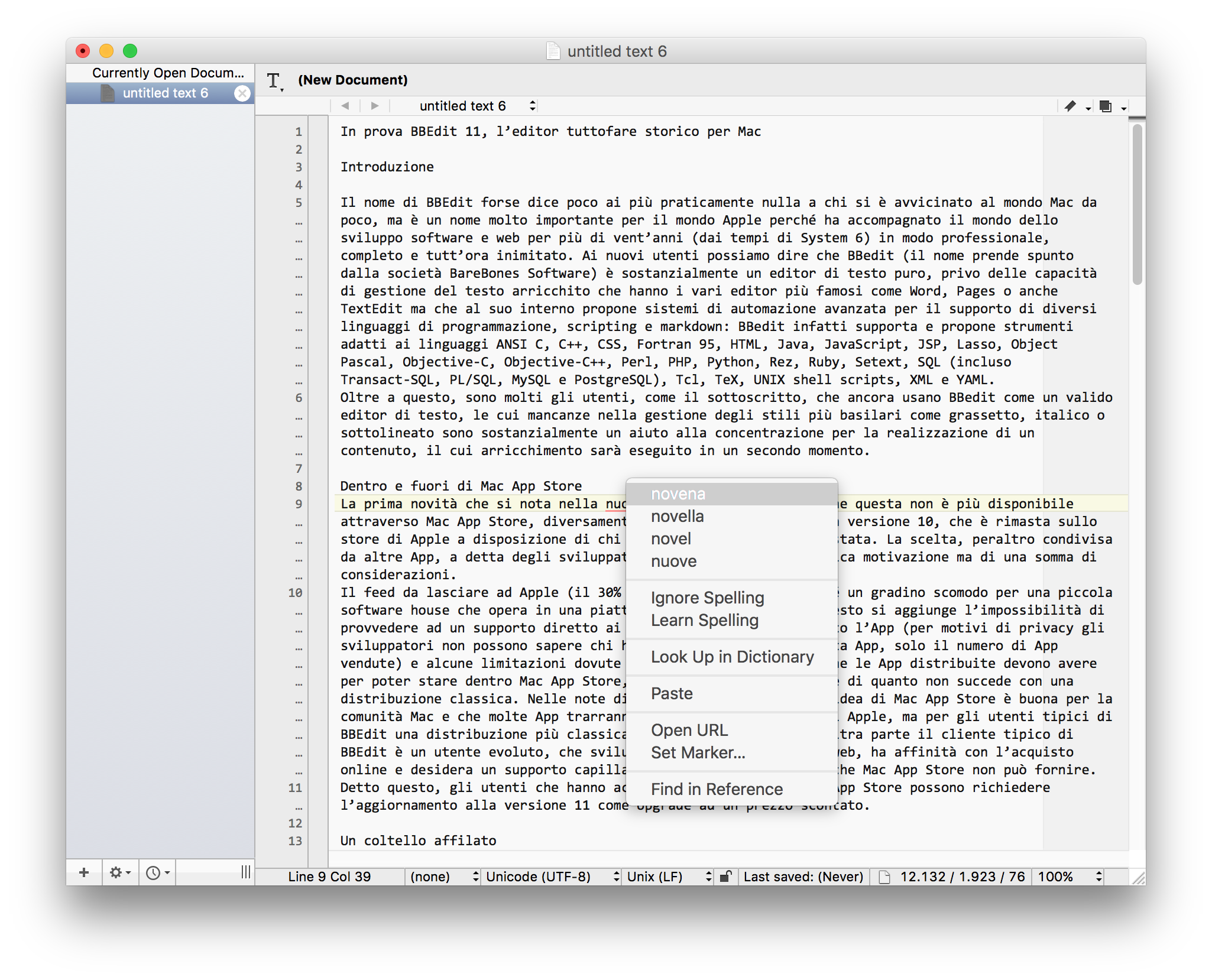 BBedit è un editor di testo puro, una App che richiede al minimo OS X 10.8.5 ma compatibile con OS X 10.11. Le capacità di gestione del testo sono affiancate dalla presenza di diversi tipi di dizionario che trasformano il documento aperto evidenziando le zone di markdown, proponendo scorciatoie e abbreviazioni durante la scrittura, automatizzando la creazione di zone comuni nella creazione dei documenti (come l’intestazione) e di pattern per variabili e comandi per tutti i linguaggi di cui sopra abbiamo parlato.