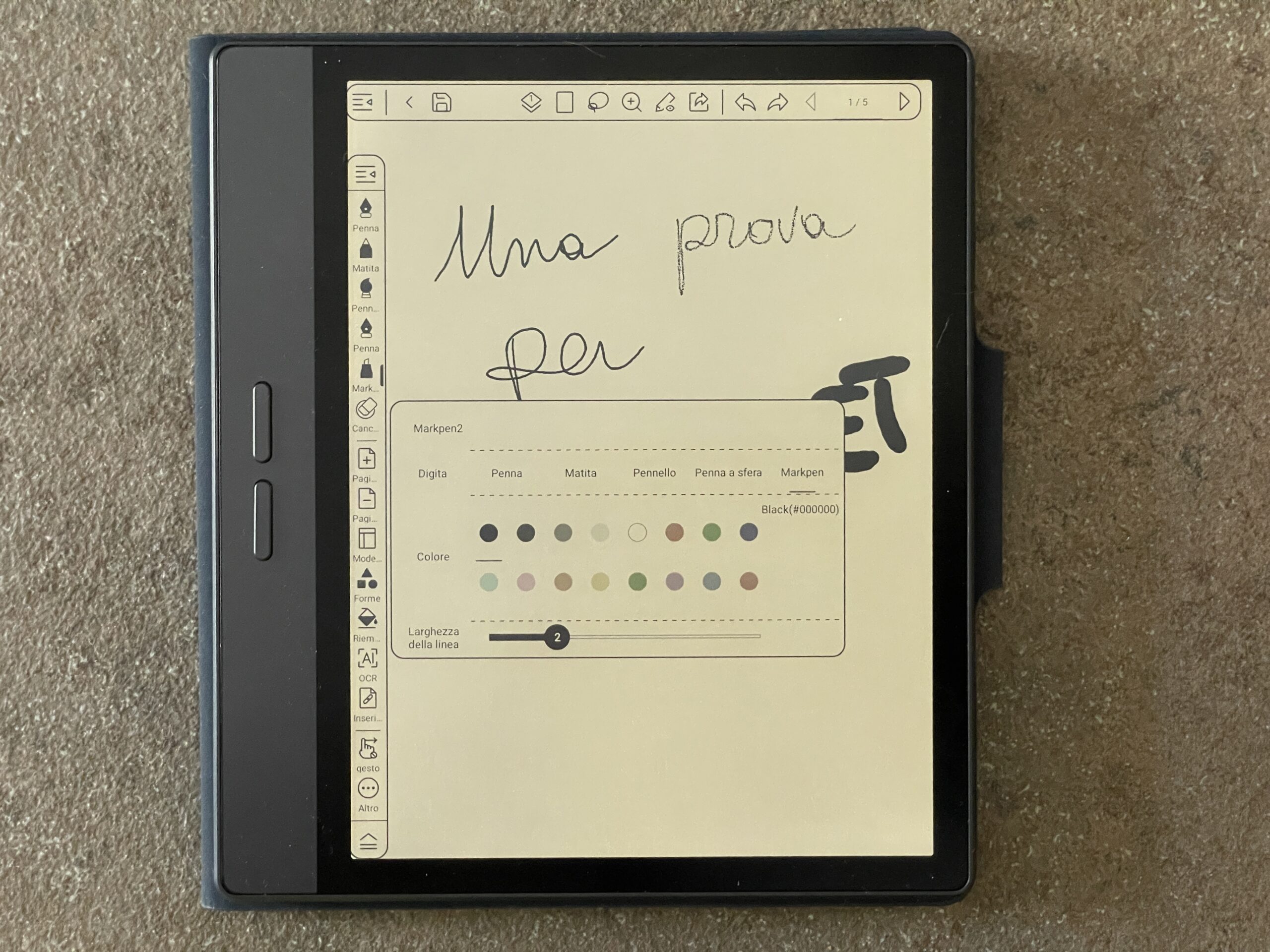 Incluso nella confezione troviamo uno stilo con 4.096 livelli di pressione, ricaricabile via wireless. La precisione è molto buona e l’esperienza di scrittura ricorda quella su Remarkable o Onyx Boox. L’app preinstallata per prendere appunti è molto buona e supporta colori, livelli, annotazioni vocali, OCR e salvataggio in PDF.