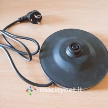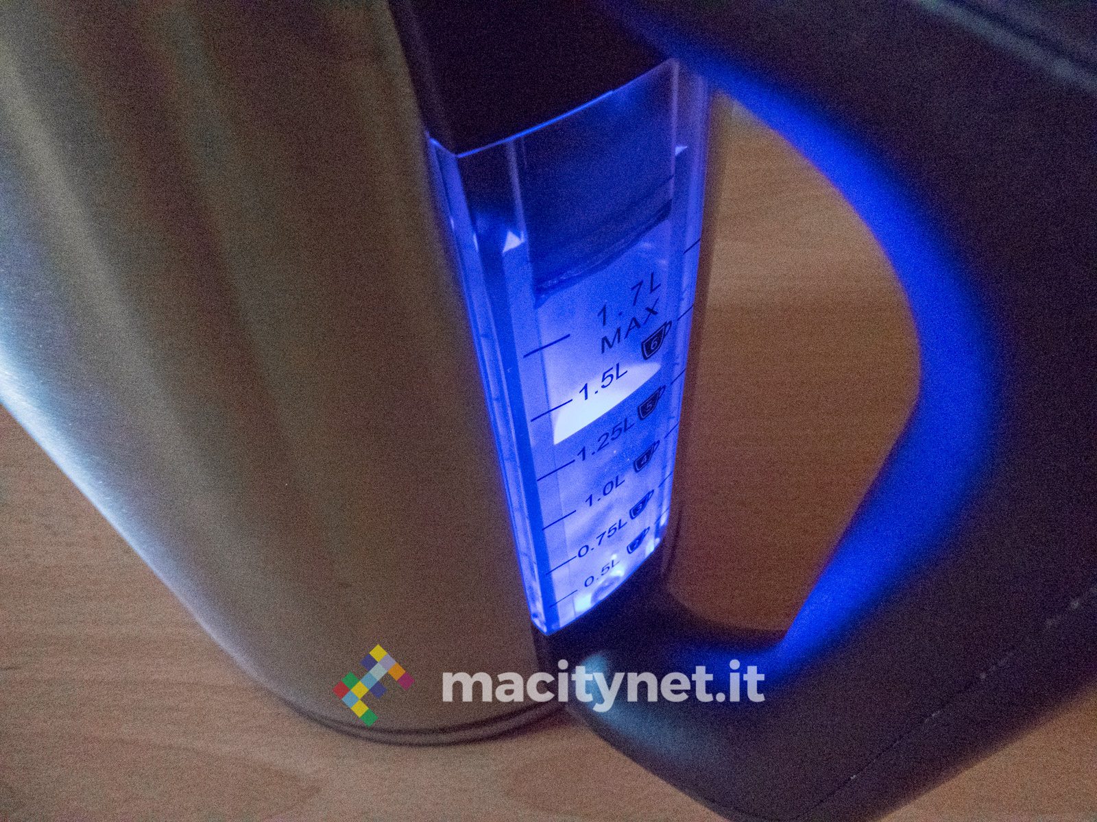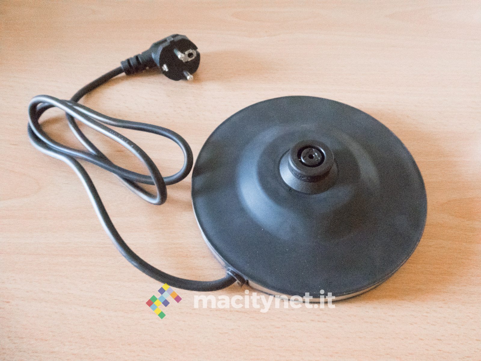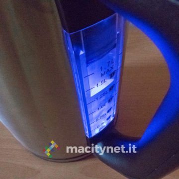 Parlare di funzionamento può risultare pressoché banale, in quanto è sufficiente collegare l’apposita base alla presa elettrica (utilizza un cavo lungo 1 metro con spina Schuko), appoggiare il bollitore sopra di essa facendo combaciare il perno con la relativa apertura. All’interno del bollitore si accenderà una luce LED di colore blu che illuminerà interamente la scala graduata, un effetto visivo piacevole e che rende bene l’idea del fatto che il sistema si attivo e funzionante.