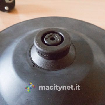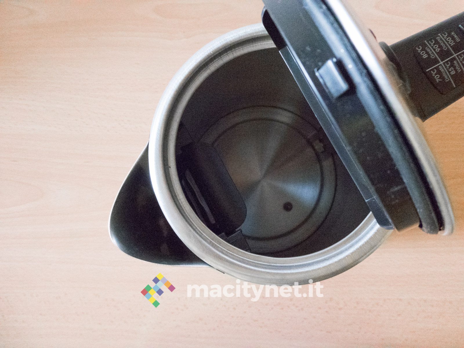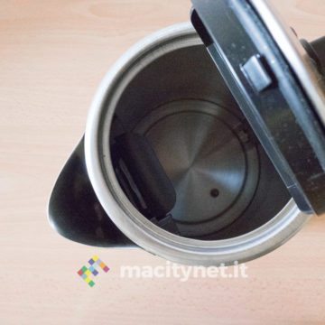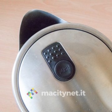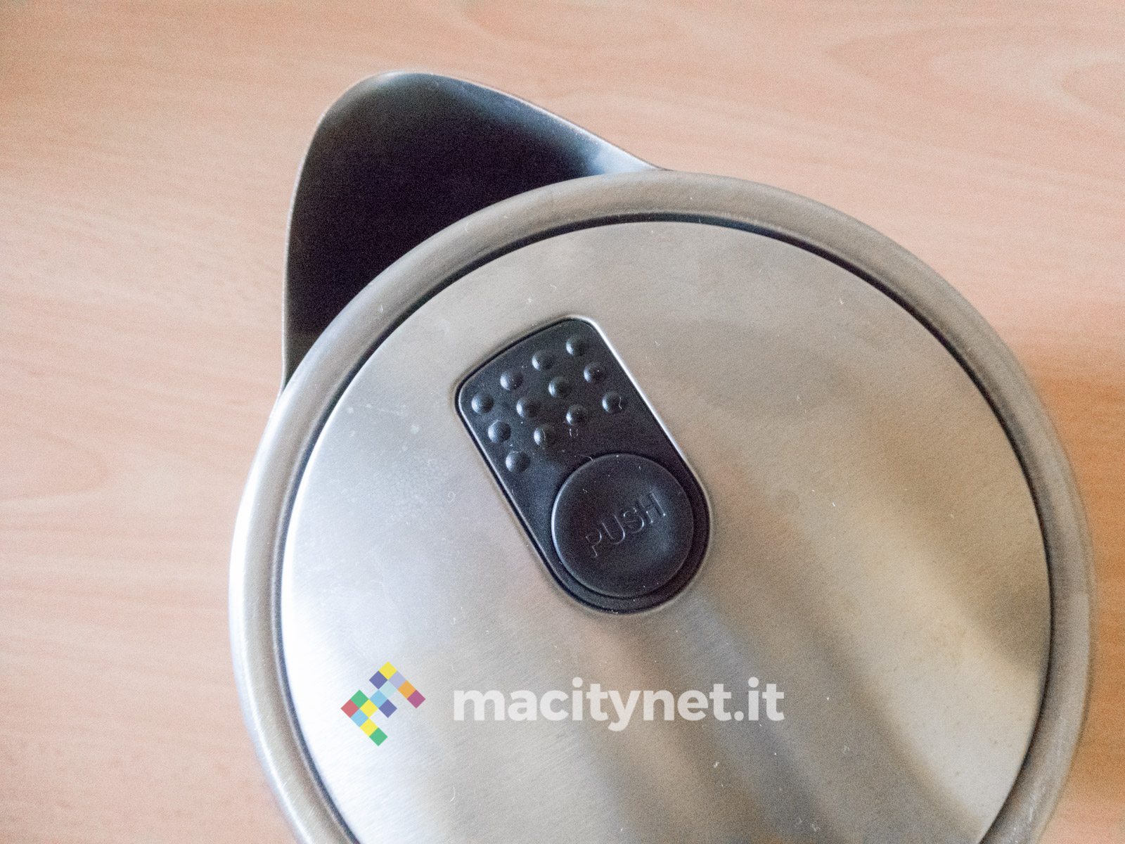Per caricare l’acqua all’interno del bollitore è sufficiente pigiare il pulsante Push al di sopra di quest’ultimo: con uno scatto si aprirà il coperchio, chiuso ermeticamente da un sistema a pressione coadiuvato da una spessa guaina in gomma. Il coperchio risulta a nostro avviso un po’ troppo piccolo, non per riempire il bollitore d’acqua quanto piuttosto per poterlo asciugare all’interno con un panno, operazione necessaria soprattutto se sarà un elettrodomestico che non verrà utilizzato tutti i giorni.
