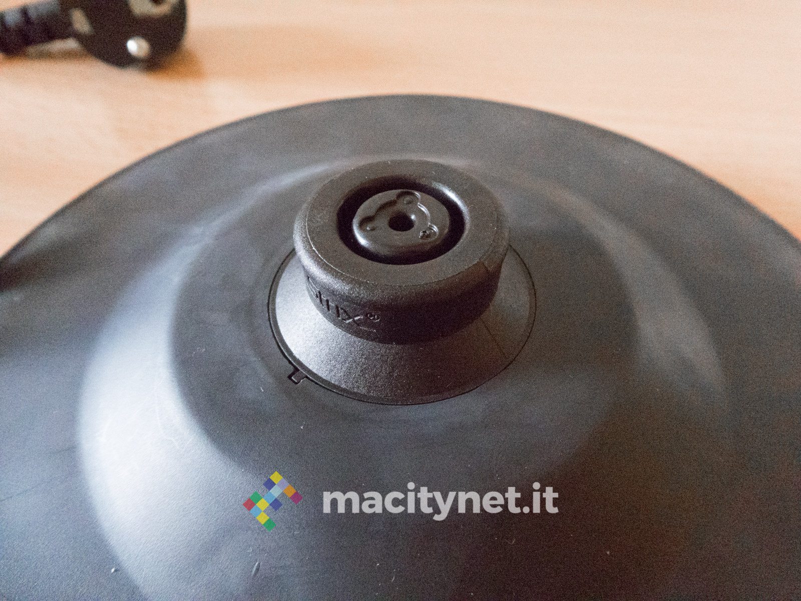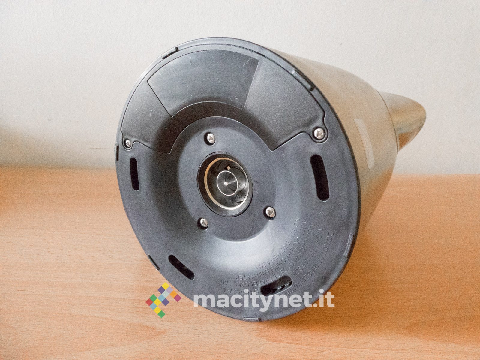 Il beccuccio è molto ampio e al primo sguardo dà l’impressione di non poter funzionare come si spera, in realtà una sorta di grata in policarbonato composta da più fori incassata proprio in uscita è progettata per instradare l’acqua creando un getto morbido e piuttosto sottile, perfetto per versare correttamente l’acqua anche in una tazza di piccole dimensioni e senza che ne scappi via anche solo una goccia.