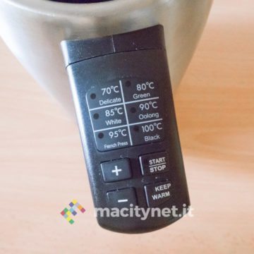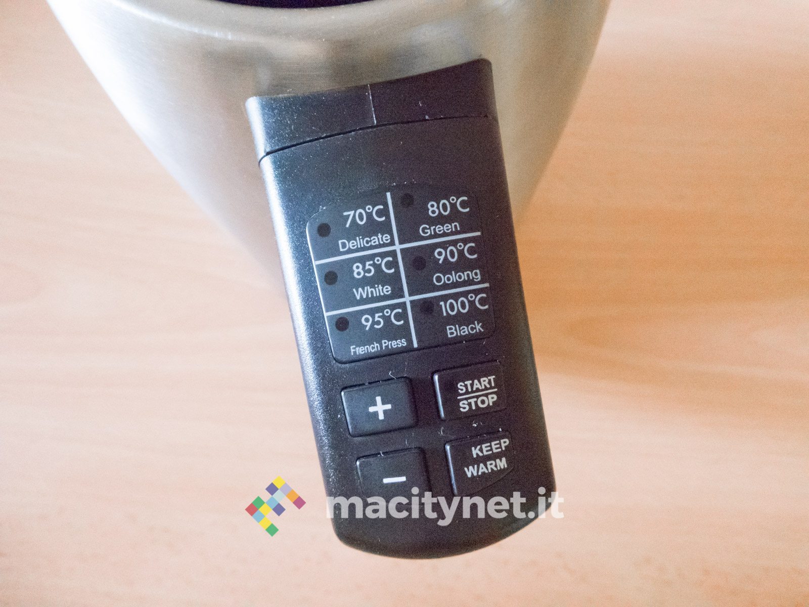 Partiamo innanzitutto dalla struttura: il corpo del bollitore è realizzato principalmente in acciaio inossidabile, con un’ampia maniglia in resistente policarbonato ed è isolata termicamente. Sul bordo superiore di quest’ultima è presente una pulsantiera che permette di regolare la temperatura dell’acqua su sei diversi livelli, ciascuno specifico per una diversa tipologia di tè, e di mantenere la temperatura al livello pre-impostato per 30 minuti dal suo raggiungimento.