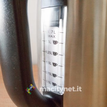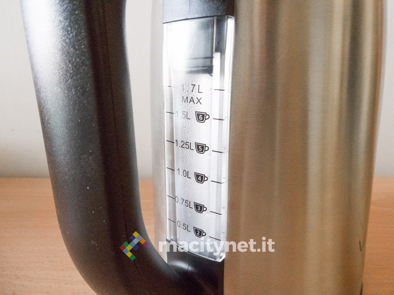 La capacità è di 1.7 litri, più che sufficiente per riempire 6-8 tazze da tè. Per sapere quant’acqua è stata inserita all’interno del bollitore basta poggiarlo su una superficie piana e leggere il livello dalla scala graduata incassata in un pannello trasparente sul retro, in prossimità della maniglia.