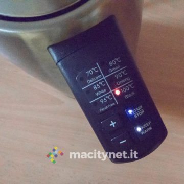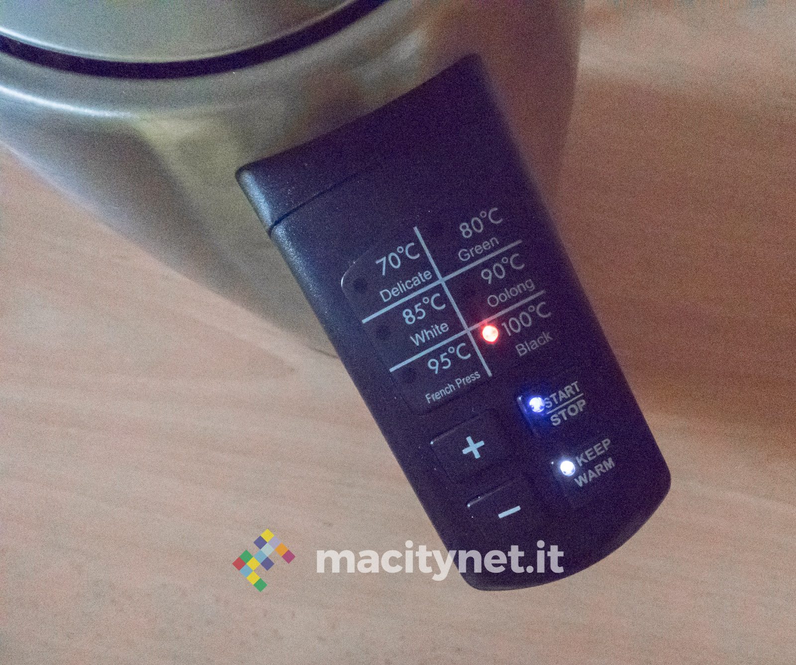 A questo punto non resta che impostare la temperatura dell’acqua desiderata attraverso la pressione dei tasti (+) e (-) e premere il pulsante di avvio, opzionalmente attivando anche il Keep warm per mantenere la temperatura impostata costante per mezz’ora. Un segnale acustico confermerà l’avvio del riscaldamento, che avverrà silenziosamente a meno che non si opti per i 100 gradi: in quel caso l’acqua a temperatura bollirà e il suo relativo gorgogliare sarà ben udibile.
