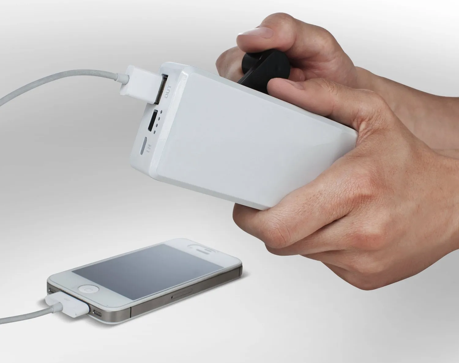 Il funzionamento è ovviamente molto semplice. Se siete in prossimità di una presa, la batteria si ricarica con un normale alimentatore. L’energia si ripristina in un paio d’ore con la carica massima segnalata dai quattro LED blu accesi. A quel punto, come abbiamo potuto sperimentare, riempirete interamente un iPhone 5 (che ha 1440 mAh di batteria interna) prima di essere costretti a ricaricarla. È questo punto, ipotizzando che siate lontani da una presa di corrente, che subentra la manovella: girandola metterete in azione la dinamo interna e saranno i vostri muscoli a generare la corrente e non avrete più bisogno della rete elettrica.