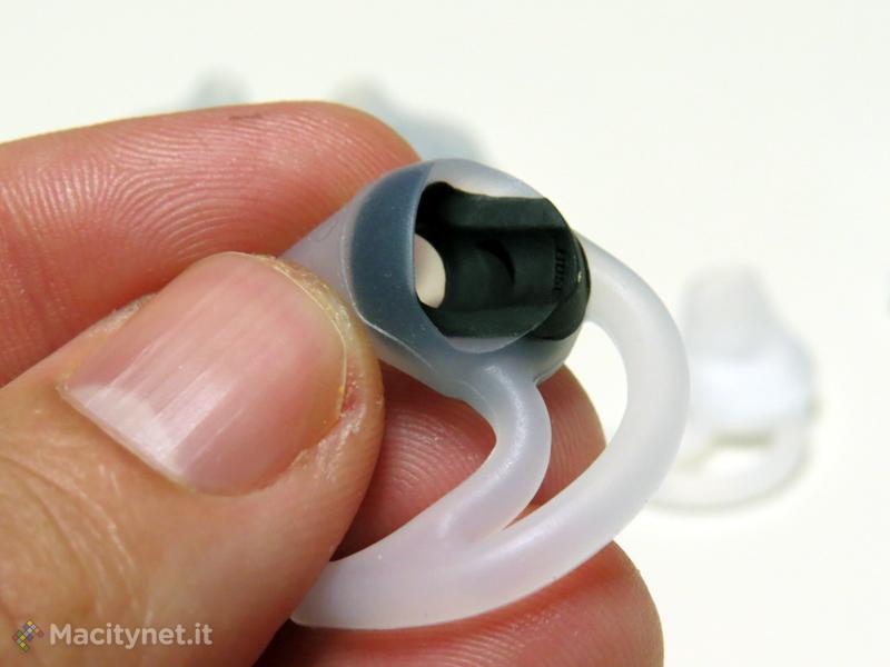 Le cuffie sportive SIE2i sono disponibili in due colori molto vivaci, giallo e arancione con inserti grigi e sono segnate, oltre che da colori “aggresivi” da uno stile peculiare che esalta la loro destinazione per l’attività fisica. Colorazione a parte, nonostante la ridotta complessità strutturale di un prodotto come degli auricolari, Bose ha infilato in esse alcune interessanti innovazioni. Una di queste è nascosta dentro agli auricolari ed è una speciale stoffa acustica idrorepellente che resiste ad acqua e sudore, la seconda, più interessante, è il particolare sistema di calzata differente da tutti quelli che abbiamo visto fino ad oggi. StayHear (questo il nome che Bose attribuisce ad esso) è di fatto costituito da un supporto in silicone che si colloca nel padiglione auricolare, espandendosi all’interno di esso e tenendo così in posizione l’altoparlante all’interno del cavo auricolare. Il sistema, il cui funzionamento si intuisce nella foto che pubblichiamo qui accanto, riduce lo stress sull’orecchio, rende inutili i sostegni esterni di tutti i tipi (sia quelli dietro l’orecchio che quelli dietro la nuca) e migliora la traspirazione e il comfort perché l’auricolare non è spinto verso l’interno del padiglione auricolare o trattenuto saldamente al suo interno, ma oscilla seguendo il passo del corridore. Tra gli altri dettagli più comuni ma benvenuti ci sono il cavo a doppio stadio con prolunga, una clip per il fissaggio del cavo stesso e il telecomando multifunzione, che include anche il microfono.