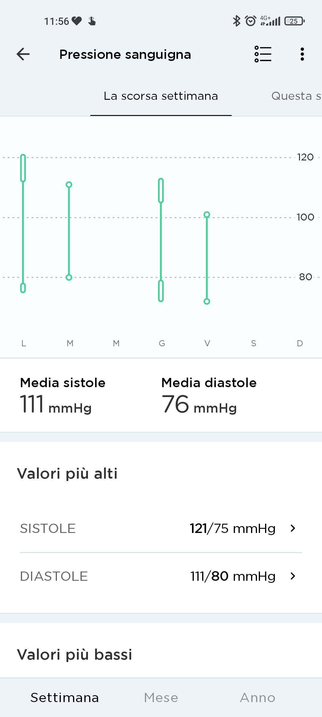 Queste singole misurazioni vengono anche aggregate per una visualizzazione settimanale, mensile, e annuale, così da poter visualizzare le letture sistoliche e diastoliche medie, nonché visualizzare le misurazioni più alte e più basse.