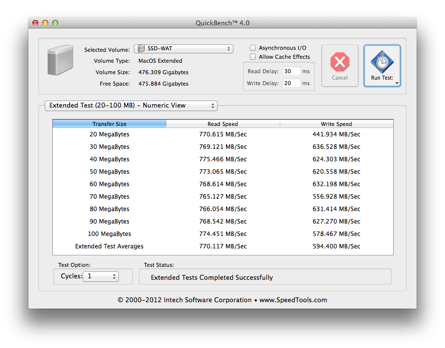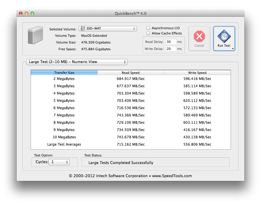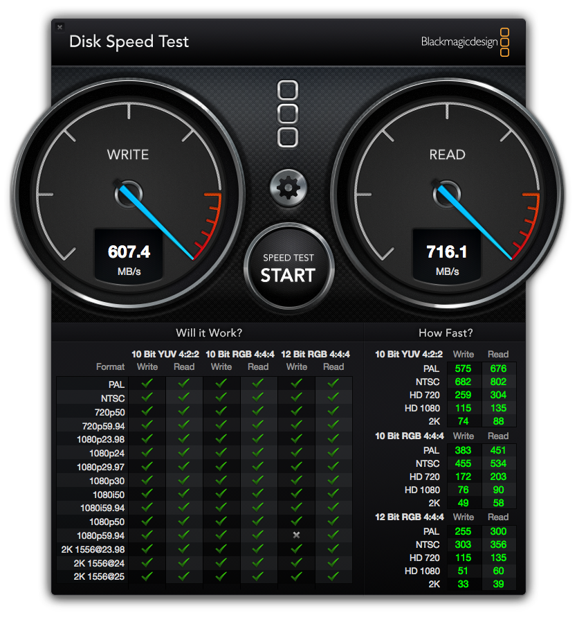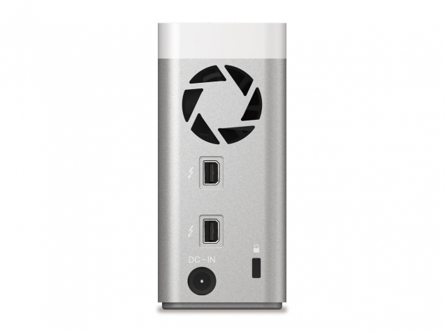L’unità esce dalla fabbrica già formattata con file system HFS+ e in modalità RAID 0 striping, ideale per sfruttare appieno tutte le componenti hardware di questo dispositivo. Le due unità SSD integrate infatti vengono sfruttate come un unico disco fisso: l’utente ha a disposizione così 512 GB di capacità con il vantaggio di suddividere i carichi di lavoro per lettura e scrittura dei dati sui due SSD. Quando inviamo dati per la scrittura metà vengono registrati su un SSD e l’altra metà sull’altro SSD; lo stesso avviene in lettura: un SSD legge metà dei dati e il secondo SSD l’altra metà. La modalità RAID striping è perfetta per sfruttare non solo la velocità degli SSD integrati, ma anche il controller SATA III da 6 gigabit al secondo, infine anche il collegamento Thunderbolt.