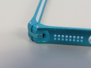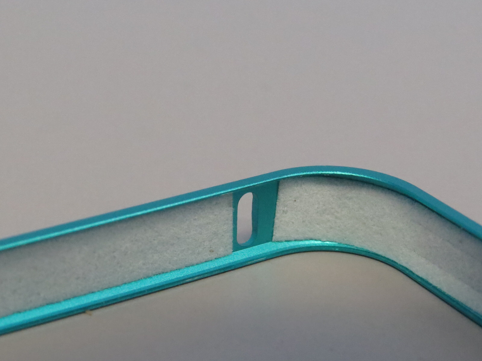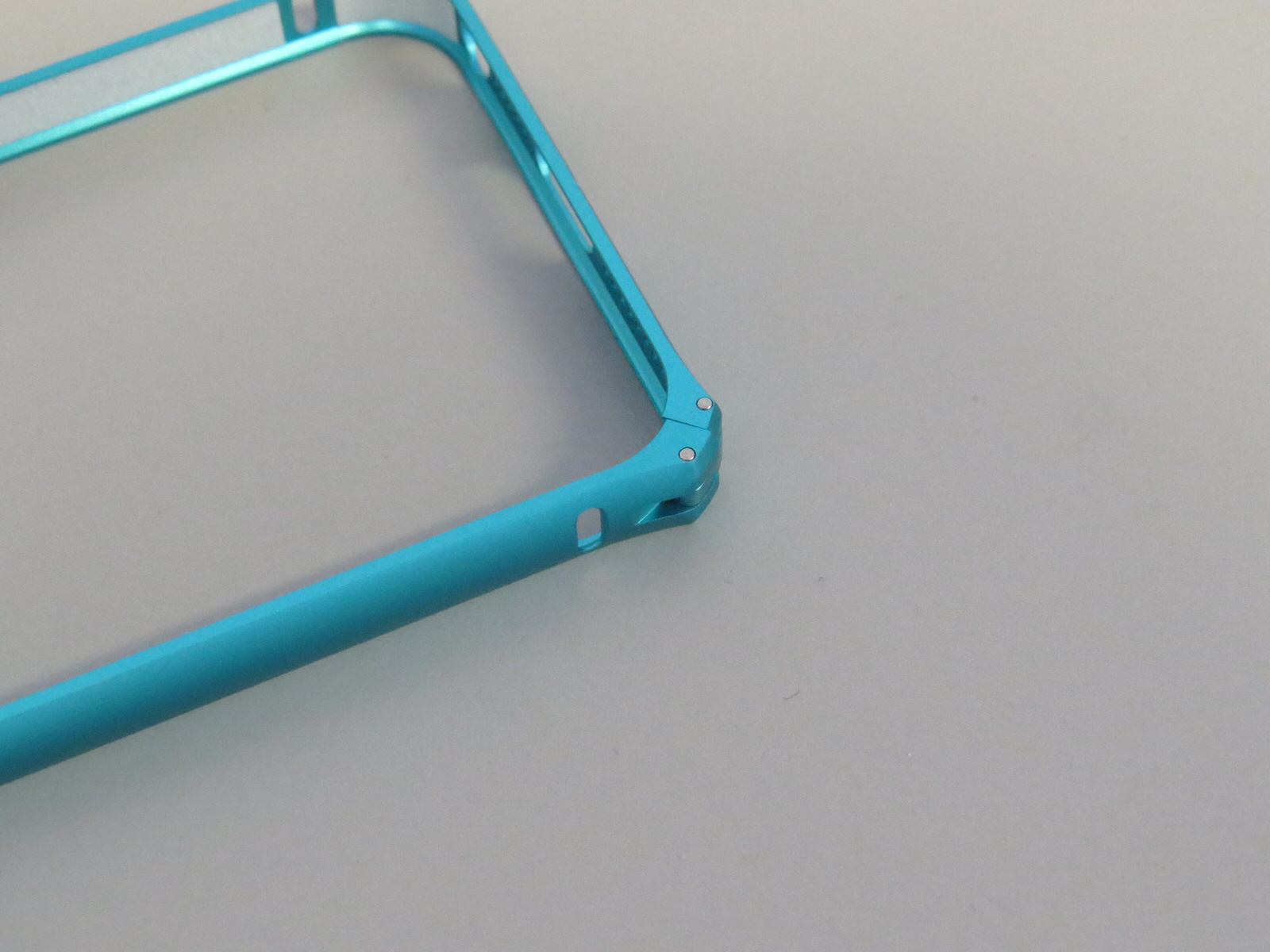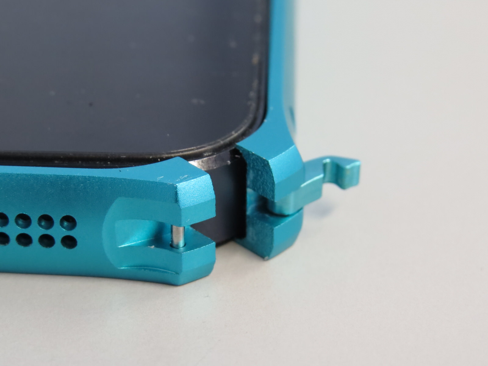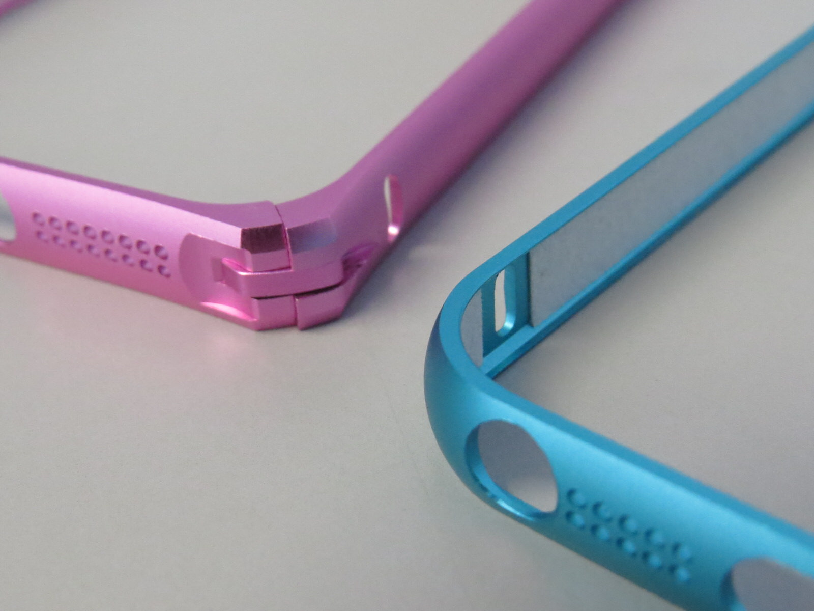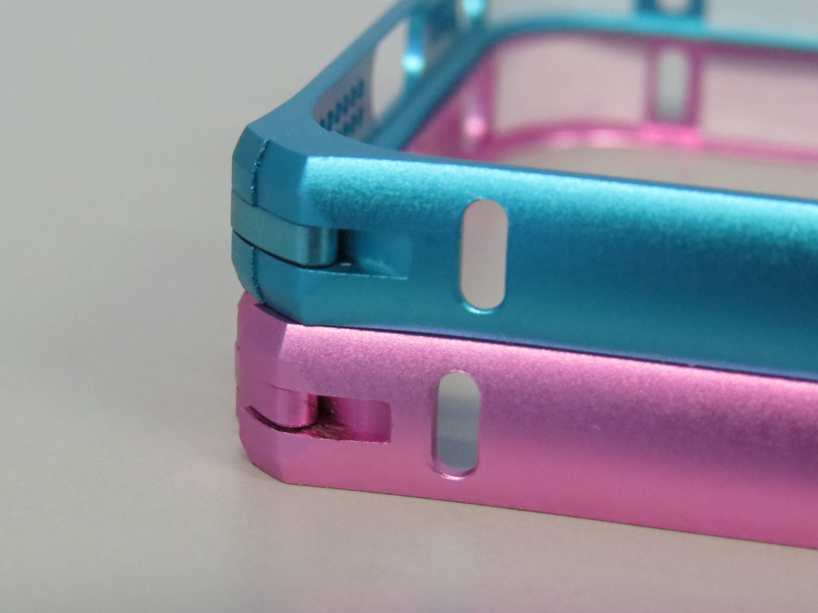 Il metallo di cui è composto è resistente, leggero ed anche colorato. I 6 colori (nero, argento, grigio scuro, azzurro, rosa e oro) sono applicati non con la verniciatura, ma mediante anodizzazione del metallo, il che dovrebbe rendere il colore più resistente. I due bumper che abbiamo avuto modo di prendere in esame hanno delle tinte piacevoli ed uniformi che il metallo rende meno impattanti dal punto di vista cromatico. Trattandosi di un bordo in alluminio e non in gomma, la cornice ha un originale sistema di chiusura con un gancio. Una volta aperto l’angolo dove troviamo il sistema di blocco, la cornice si aprirà e potremo inserire all’interno l’iPhone.