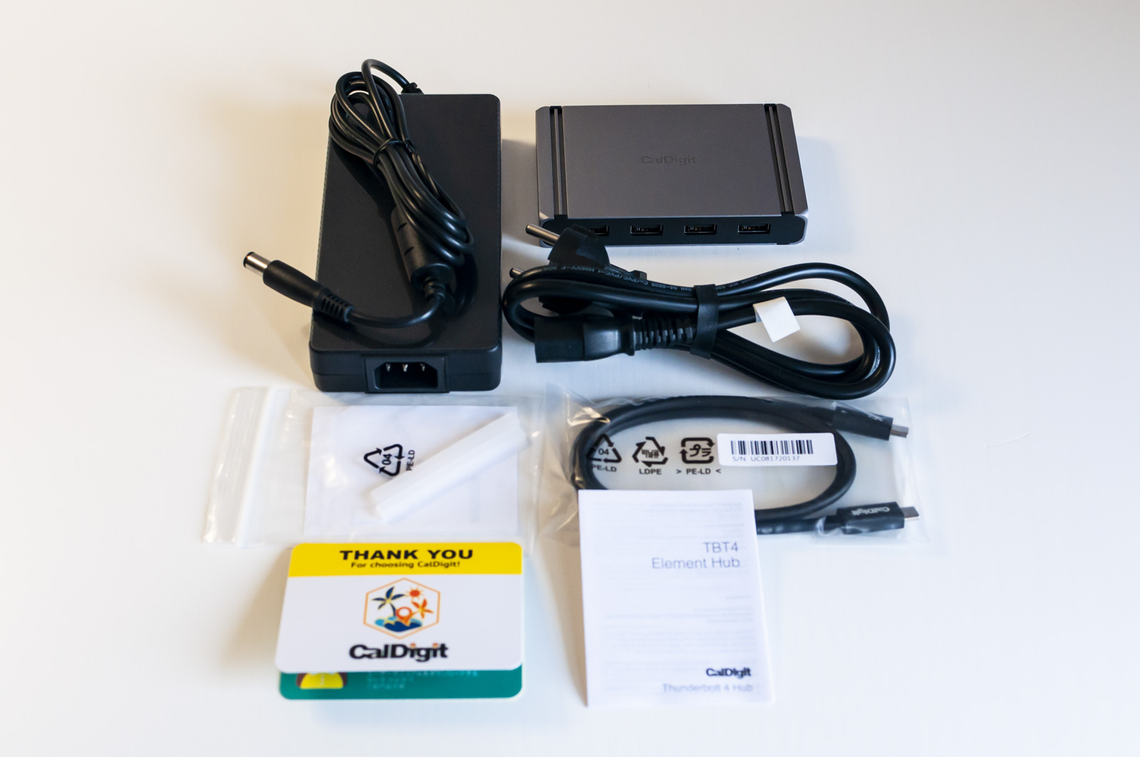Caldigit Element HUB arriva in una scatola piena zeppa di cose: ci aspettavamo di certo l’HUB ma nella scatola è presente anche l’alimentatore, di dimensioni molto generose, il cavo Thunderbolt 4, un piccolo manuale di istruzioni, i gommini e un cartoncino che in pratica è uno sconto per il prossimo acquisto Caldigit.