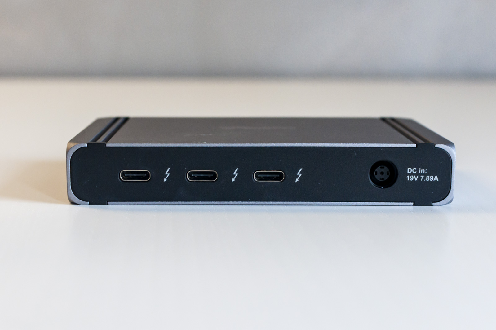 In questo modello abbiamo quattro porte USB 3.2 Gen2 a 10 Gb/s sul frontale più tre porte Thunderbolt 4 (compatibili con USB4 e USB-C) a 40 Gb/s, il tutto supportato da un alimentatore esterno (che è necessario, il che rende il Caldigit Element HUB un Device poco trasportabile).