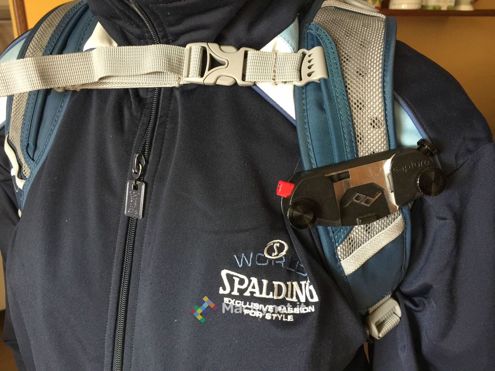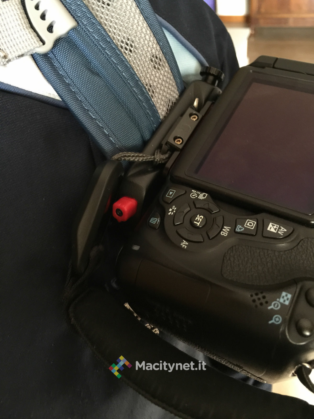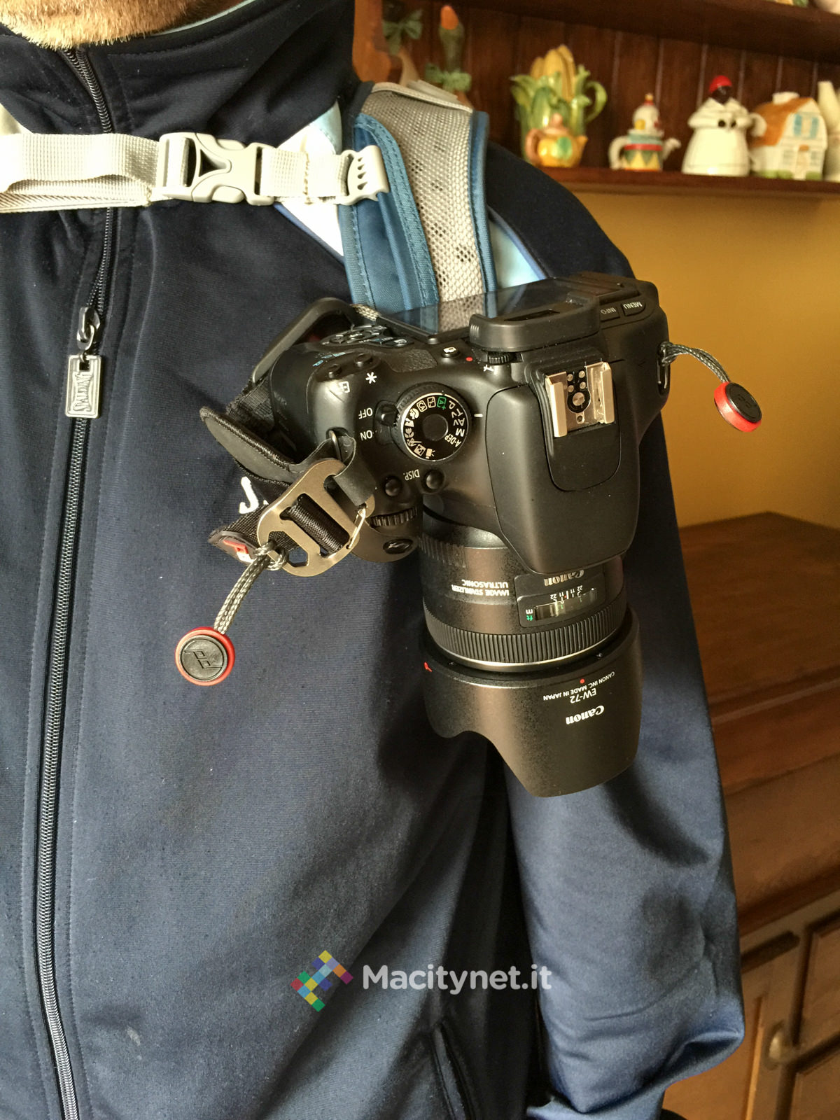 Comodo l’uso sullo spallaccio dello zaino, specialmente con quelli come il nostro dove è possibile stabilizzarli stringendoli tra loro con un moschettone: con quest’ultimo sganciato, in effetti la camera un po’ “balla”, quindi l’utilizzo risulta scomodo, sempre parlando di reflex pesanti, con zaini di scarsa qualità, non fotografici o senza questo sistema di chiusura.