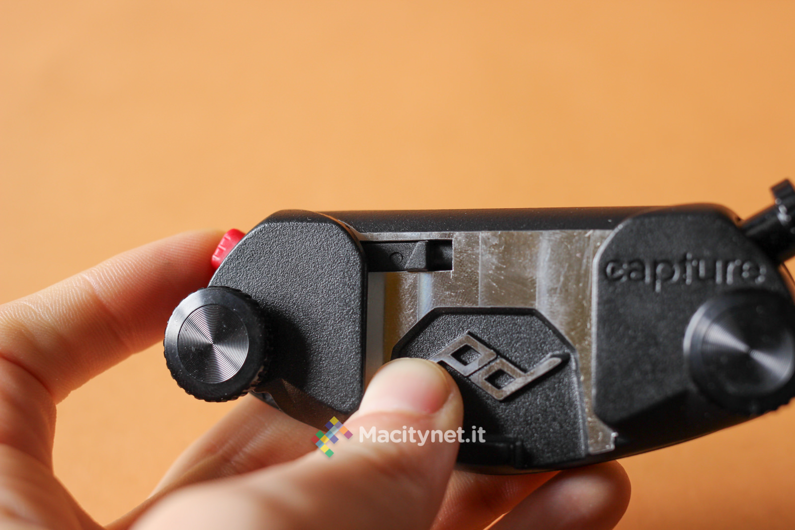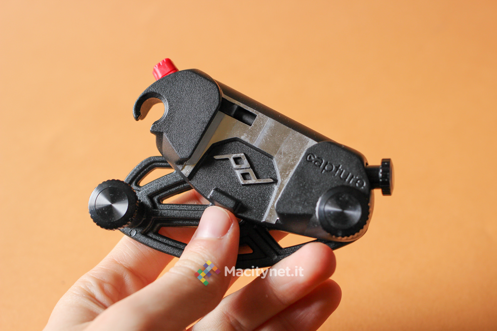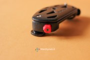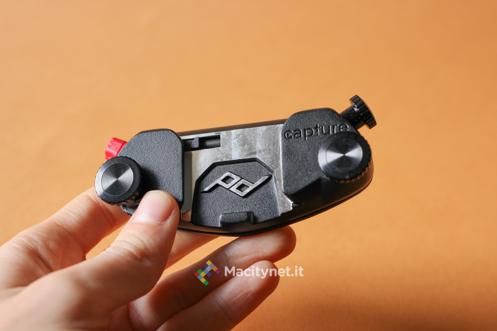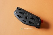 La vite di destra sostanzialmente va allargata solo in casi come questo, dove lo spessore del supporto a cui vogliamo fissare il CapturePRO è consistente. Guardandolo frontalmente, sulla sinistra è presente un pulsante rosso: questo non è altro che il pulsante di sgancio della piastra. In pratica, premendolo si muove la sicura che tiene bloccata la piastra con tutta la reflex al sistema. Per evitare pressioni accidentali durante lunghe camminate è possibile ruotarla di 45 gradi in senso orario: in questo modo il piccolo dente andrà a bloccarsi con la cassa del CapturePRO e sarà impossibile premerlo senza prima riportarlo in posizione di partenza. L’ultima vite, quella di destra, nera, serve a bloccare ulteriormente la piastra al sistema: in pratica, stringendola, una piccola lingua di metallo nascosta sulla destra va a stringere ulteriormente la piastra evitando anche i più piccoli movimenti. Ciò ne rende più precisi, e obbliga ad esercitare maggior forza, l’inserimento e la rimozione della piastra, che può piacere come no. Noi l’abbiamo stretta in rare occasioni, dove camminando molto il piccolo gioco creava un fastidioso ticchettio tra il CapturePRO e la piastra.