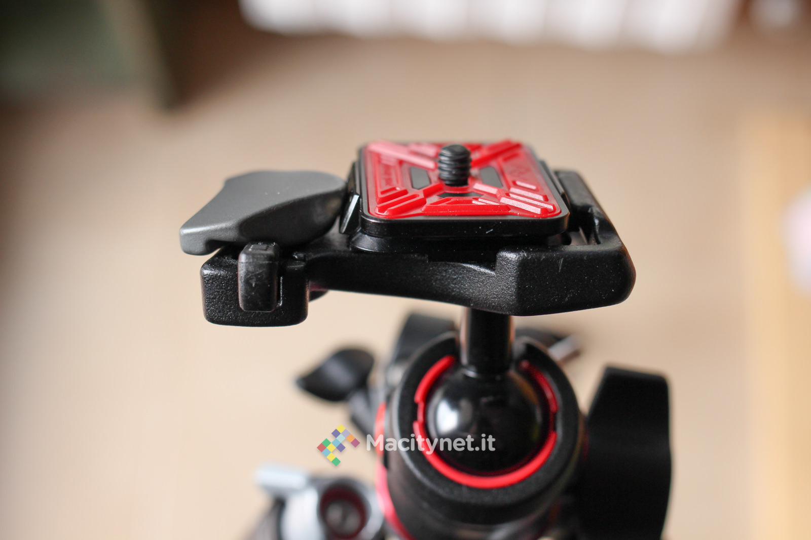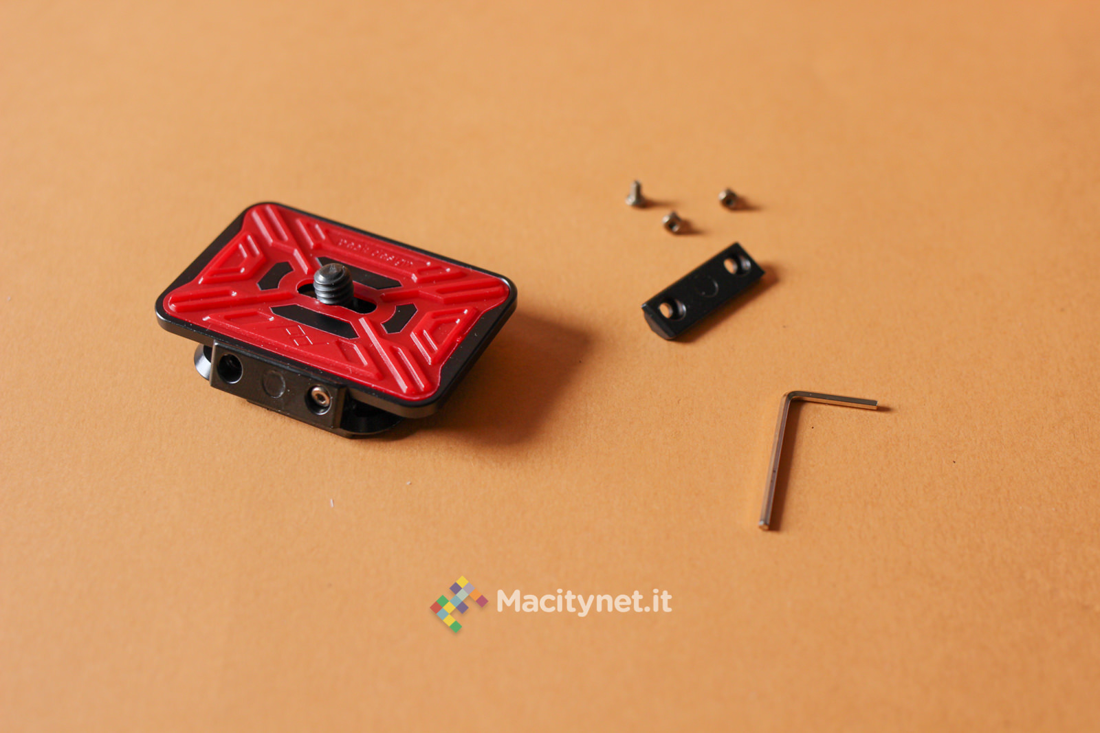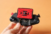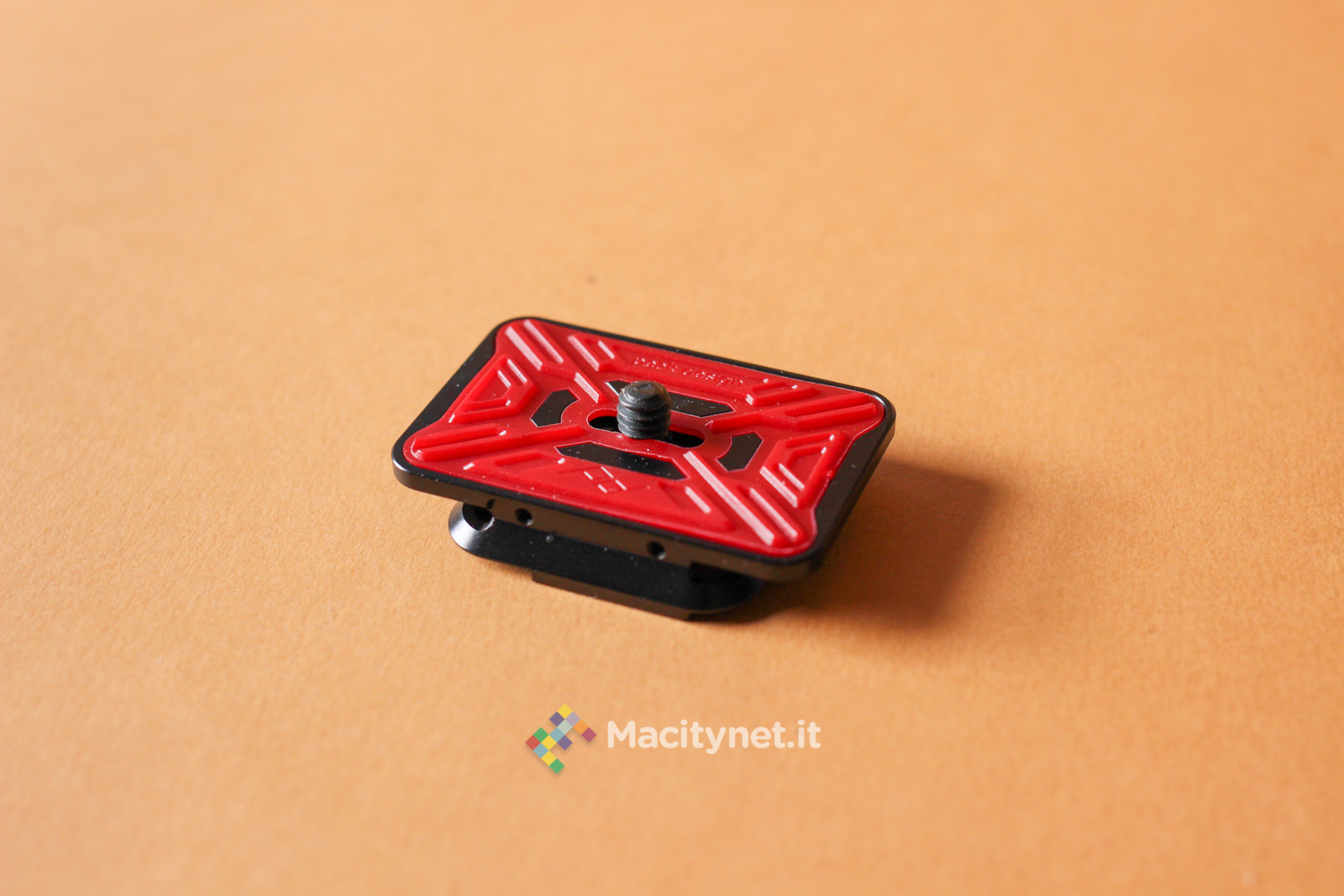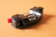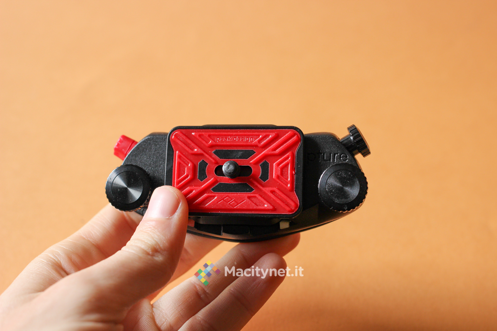 La vite di destra sostanzialmente va allargata solo in casi come questo, dove lo spessore del supporto a cui vogliamo fissare il CapturePRO è consistente. Guardandolo frontalmente, sulla sinistra è presente un pulsante rosso: questo non è altro che il pulsante di sgancio della piastra. In pratica, premendolo si muove la sicura che tiene bloccata la piastra con tutta la reflex al sistema. Per evitare pressioni accidentali durante lunghe camminate è possibile ruotarla di 45 gradi in senso orario: in questo modo il piccolo dente andrà a bloccarsi con la cassa del CapturePRO e sarà impossibile premerlo senza prima riportarlo in posizione di partenza. L’ultima vite, quella di destra, nera, serve a bloccare ulteriormente la piastra al sistema: in pratica, stringendola, una piccola lingua di metallo nascosta sulla destra va a stringere ulteriormente la piastra evitando anche i più piccoli movimenti. Ciò ne rende più precisi, e obbliga ad esercitare maggior forza, l’inserimento e la rimozione della piastra, che può piacere come no. Noi l’abbiamo stretta in rare occasioni, dove camminando molto il piccolo gioco creava un fastidioso ticchettio tra il CapturePRO e la piastra.