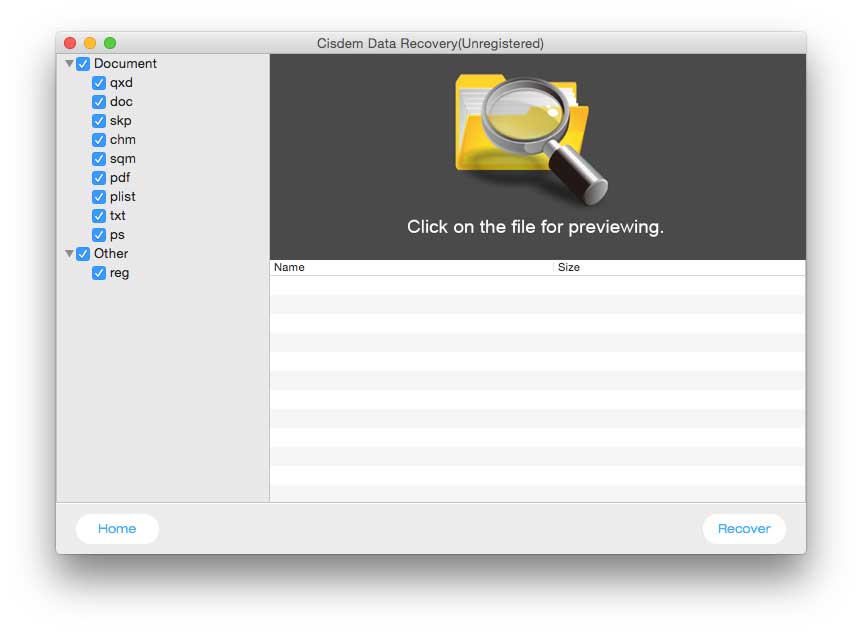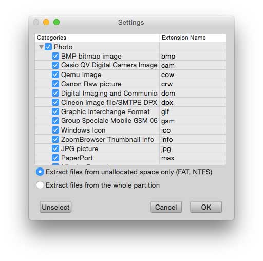 L’installazione del programma è banale: basta scaricare il software dal sito dello sviluppatore e copiare il programma (un unico file da 41MB) nella cartella “Applicazioni”. All’avvio si presenta una schermata di facile comprensione con quattro opzioni: “Document Recovery”, “Media Recovery”, “Archive File Recovery” e “Universal Recovery”. La prima opzione (“Document Recovery”) come il nome lascia intuire permette di recuperare documenti cancellati accidentalmente (doc, pdf, txt e altri) e funziona anche in caso di formattazione accidentale del disco. Dopo aver fatto click sulla voce in questione, basta selezionare la partizione da analizzare e fare click su “Scan” per avviare la scansione dell’unità selezionata alla ricerca dei file perduti. I tempi di scansione dipendono ovviamente dalle dimensioni e dal tipo di disco da analizzare (le unità SSD saranno scansionate ovviamente più velocemente rispetto ai tradizionali HDD o ai dischi USB). Prima di eseguire la scansione è possibile fare click sul pulsante a forma di ruota dentata per indicare la tipologia di file da individuare, evitando di cercare file che non sono di nostro interesse. L’unità SSD da 128GB di un MacBook Air metà 2013 è stata analizzata in circa 10 minuti, al termine dei quali sono stati proposti vari file che avevamo effettivamente cancellato, svuotando il cestino.