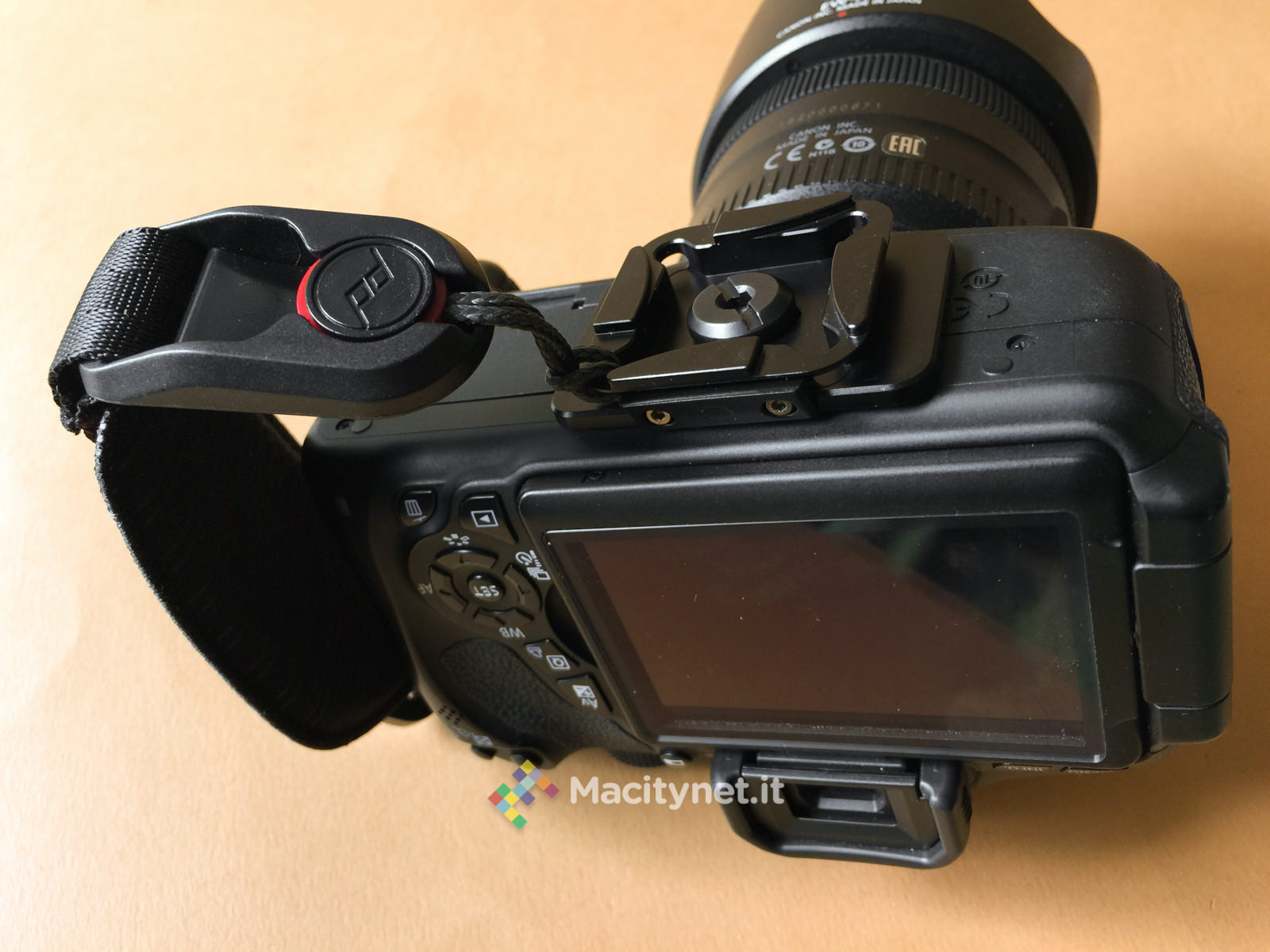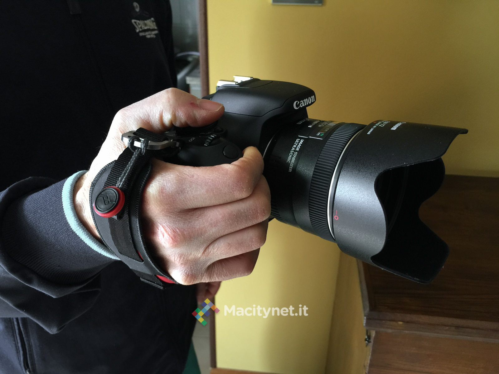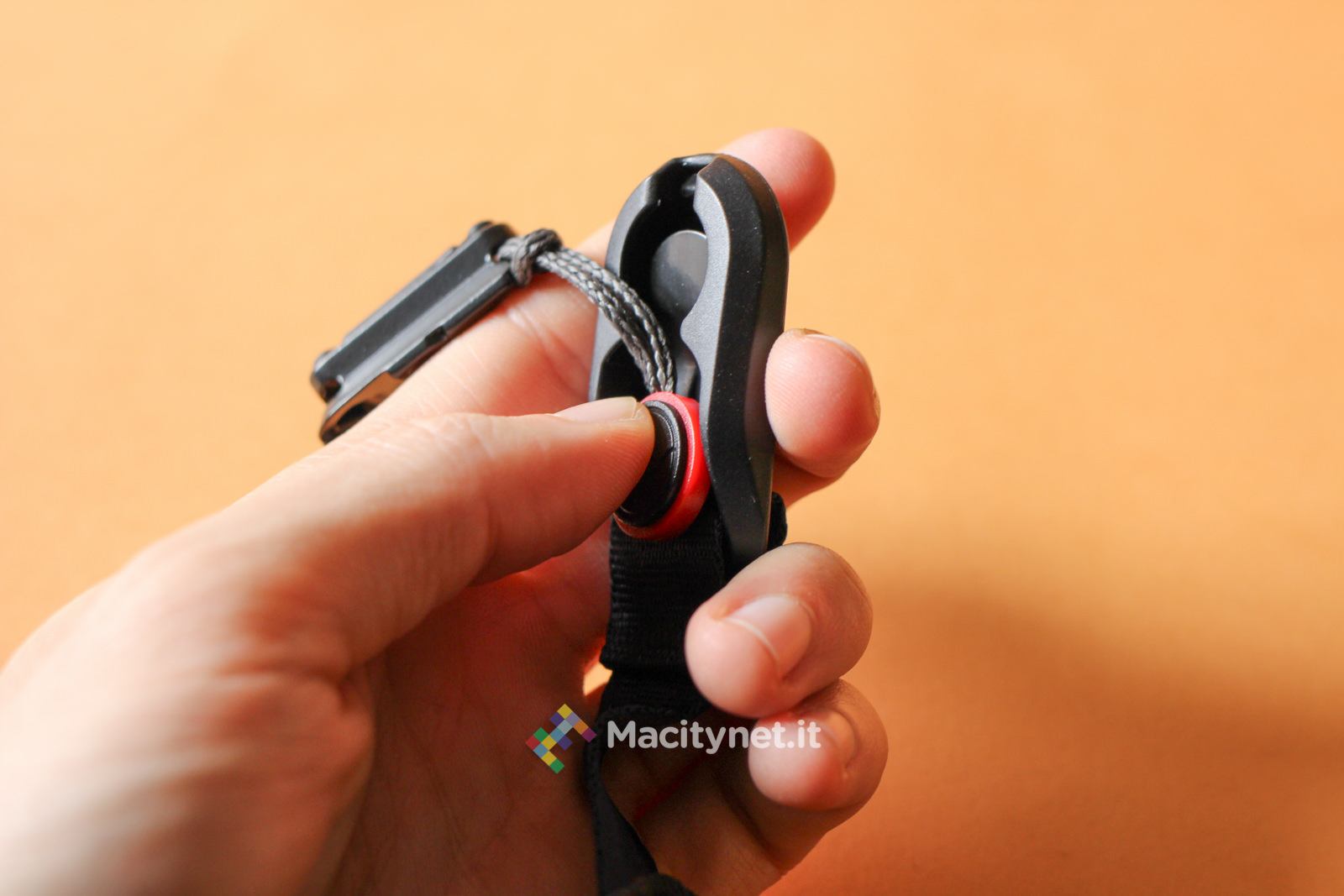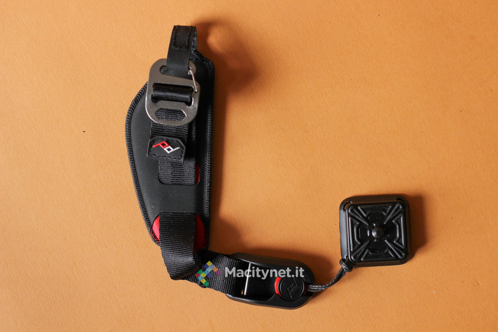 Fissare l’HS alla reflex è più facile di quanto possa sembrare. E’ sufficiente aprire il moschettone e lasciar scivolare fuori la resistente linguetta che va infilata nel foro destro della reflex, quello dove solitamente si attacca la tracolla. E’ importante segnalare che in alcune fotocamere, come nel caso della nostra Canon 600D, il foro offre spazio sufficiente per la sola tracolla o il solo HS, quindi nel caso si opti per questa soluzione è bene tenere a mente che non sarà compatibile con la tracolla venduta in dotazione con la camera o con altri sistemi simili che si agganciano ai due fori laterali della reflex. Può invece eventualmente essere utilizzato con tracolle di altri brand e si sposa perfettamente con una di quelle vendute dalla Peak Design stessa, come la Slide che recensiremo nei prossimi giorni.