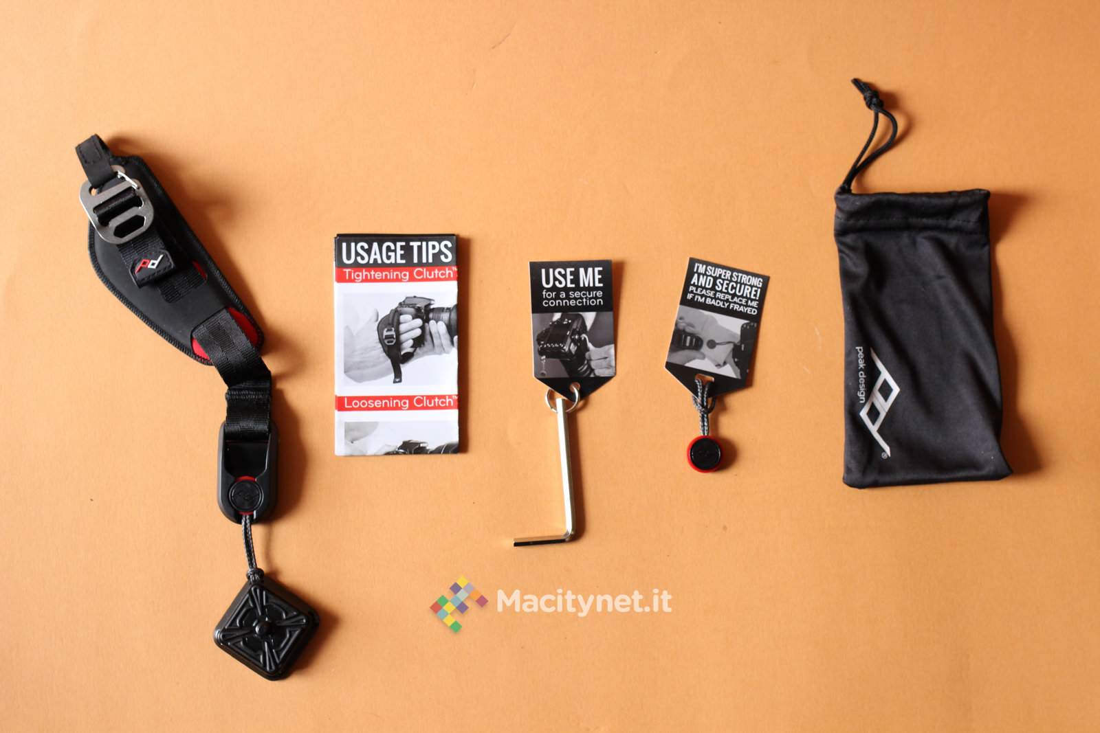 L’hand strap (che da questo momento abbrevieremo con HS) arriva a casa all’interno di una scatola in cartone illustrato ben fatta, caratterizzata da un’apertura a strappo che permette fin da subito di apprezzare il contenuto ed i materiali dell’accessorio. Fissato ad un pannello in cartone con alcuni lacci, insieme all’HS troviamo una soffice sacca per il trasporto insieme ad una chiave per il fissaggio della piastra sulla reflex ed un Anchor aggiuntivo.