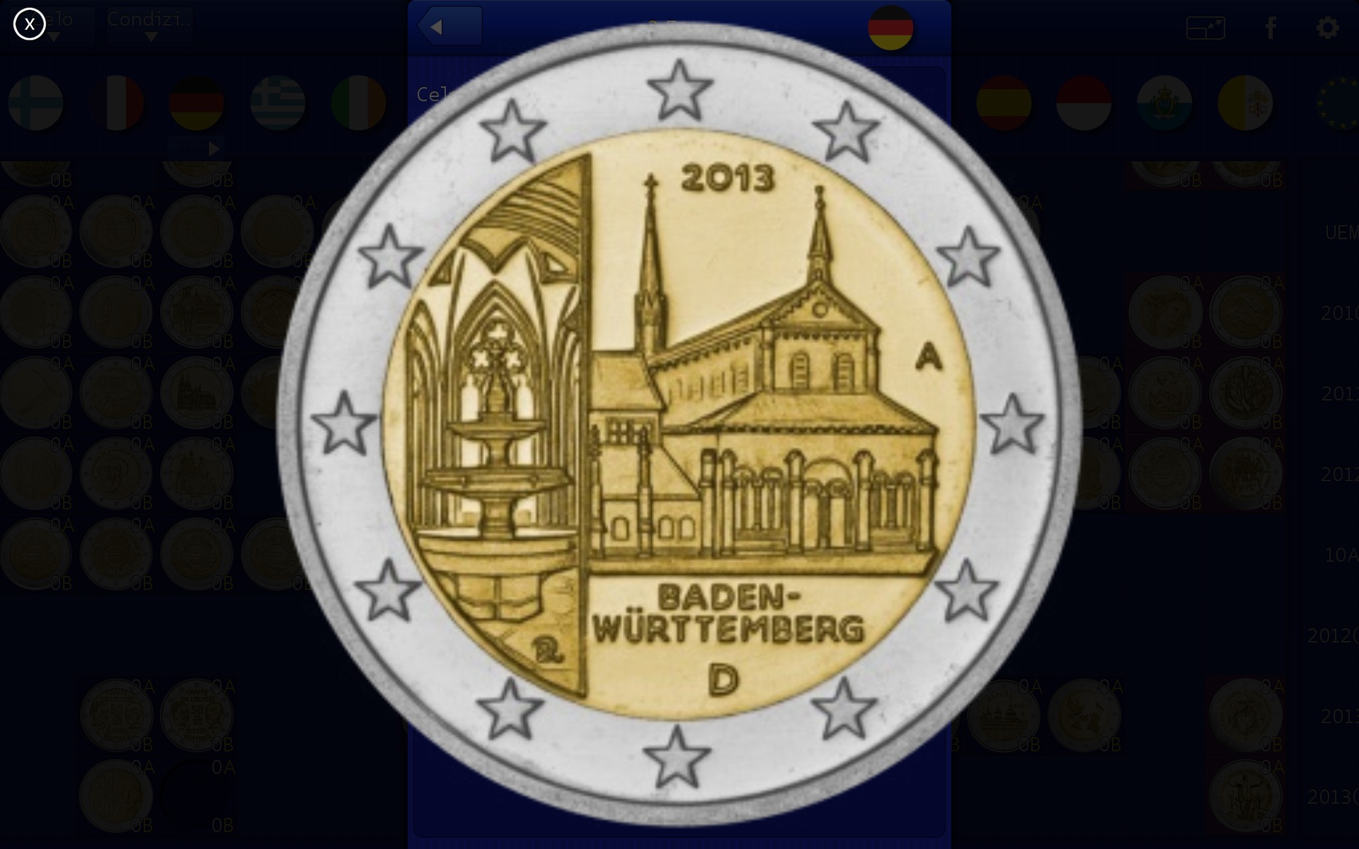 Esistono due modi per collezionare le monete degli euro, e Collezione Euro Monete le supporta entrambe. La prima è la modalità classica: si colleziona la serie completa delle monete per ciascuna nazione che aderisce alla moneta unica. In questo momento sono 17 nazioni che adottano l’euro, composto per quanto riguarda i tagli metallici da otto denominazioni diverse: 1 cent, 2 cent, 5 cent, 10 cent, 20 cent, 50 cent, 1 euro, 2 euro. La collezione è completa quando si possiede un esemplare di ciascuna denominazione per ciascuna nazione. In questo senso la pagina principale dell’app di Orlando è molto semplice: in orizzontale ci sono le nazioni e in verticale le monete, si può indicare quali monete si posseggono, in quale stato, quanti esemplari, e in generale si può vedere come sono fatte le monete di ciascun paese, che ne personalizza il lato principale.