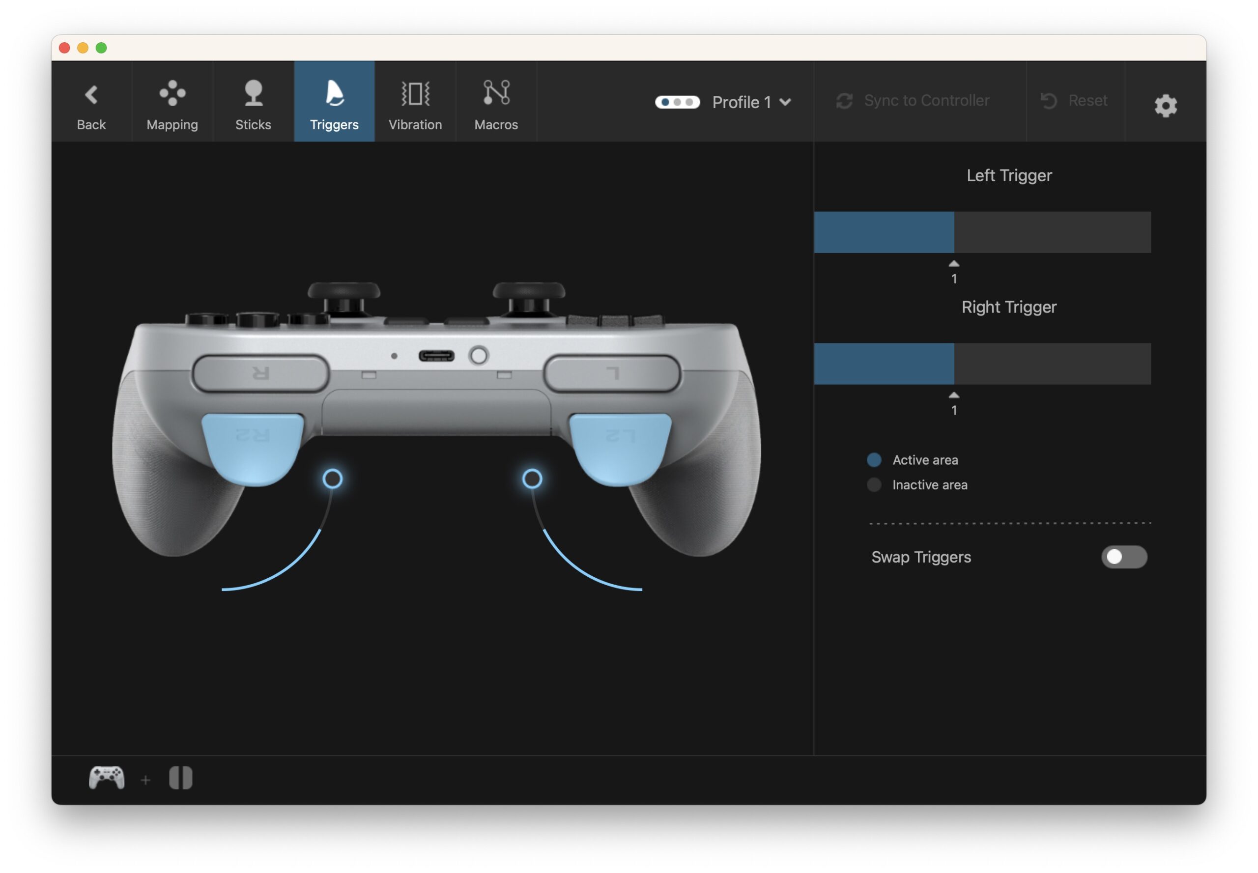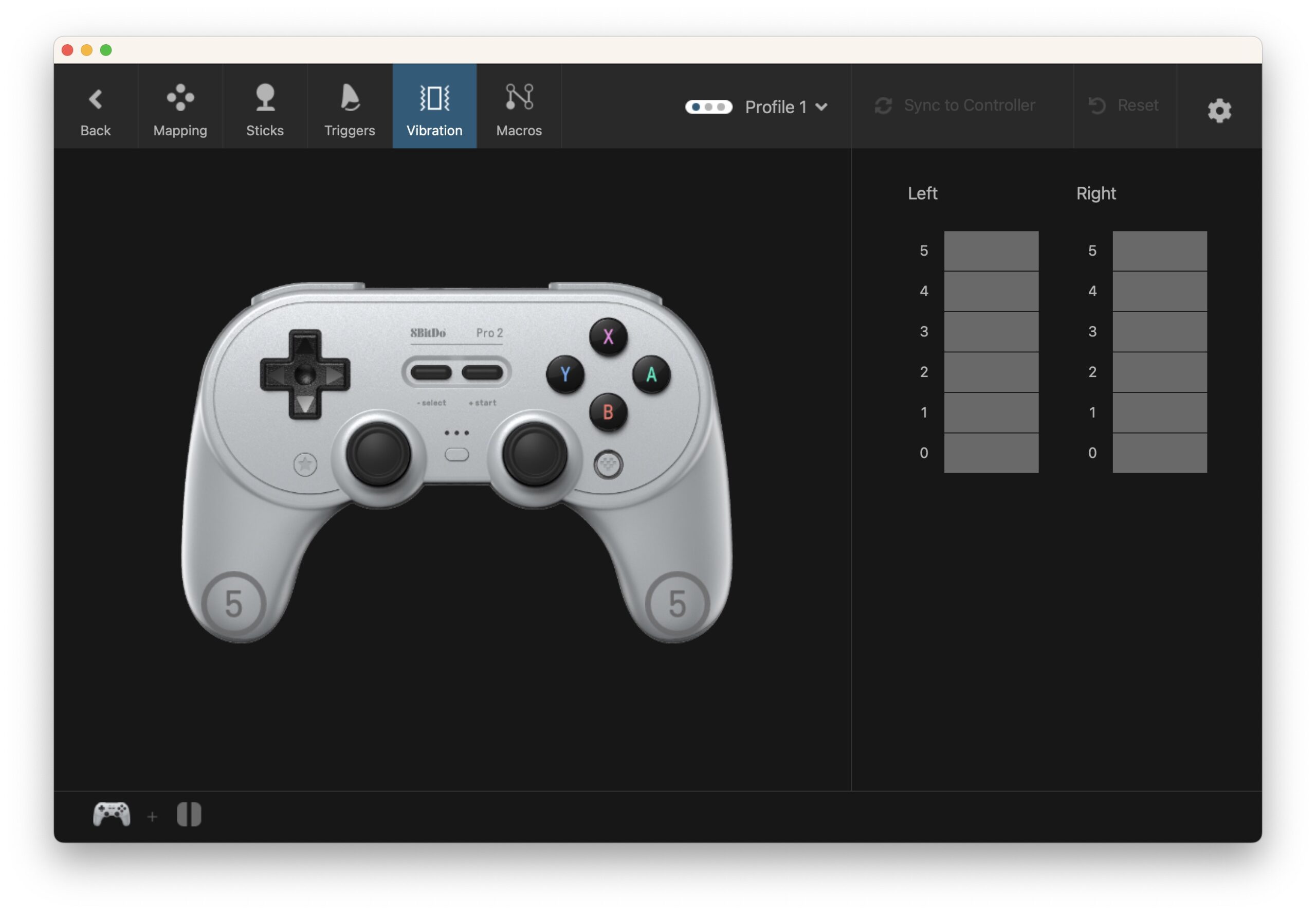 Infine, è possibile configurare l’intensità della vibrazione e le macro, ossia sequenze di input del controller da richiamare con un solo tasto o una combinazione di tasti.