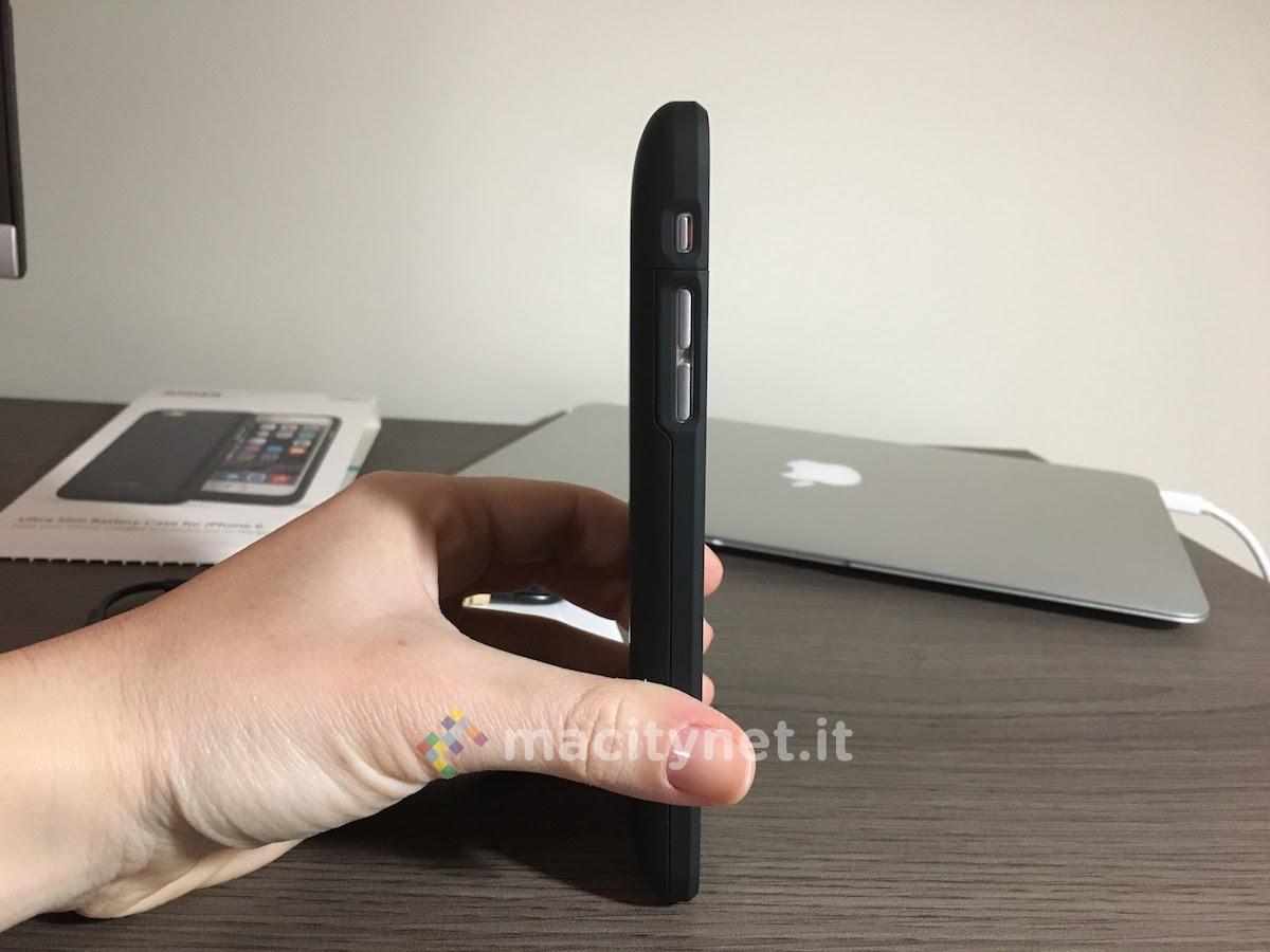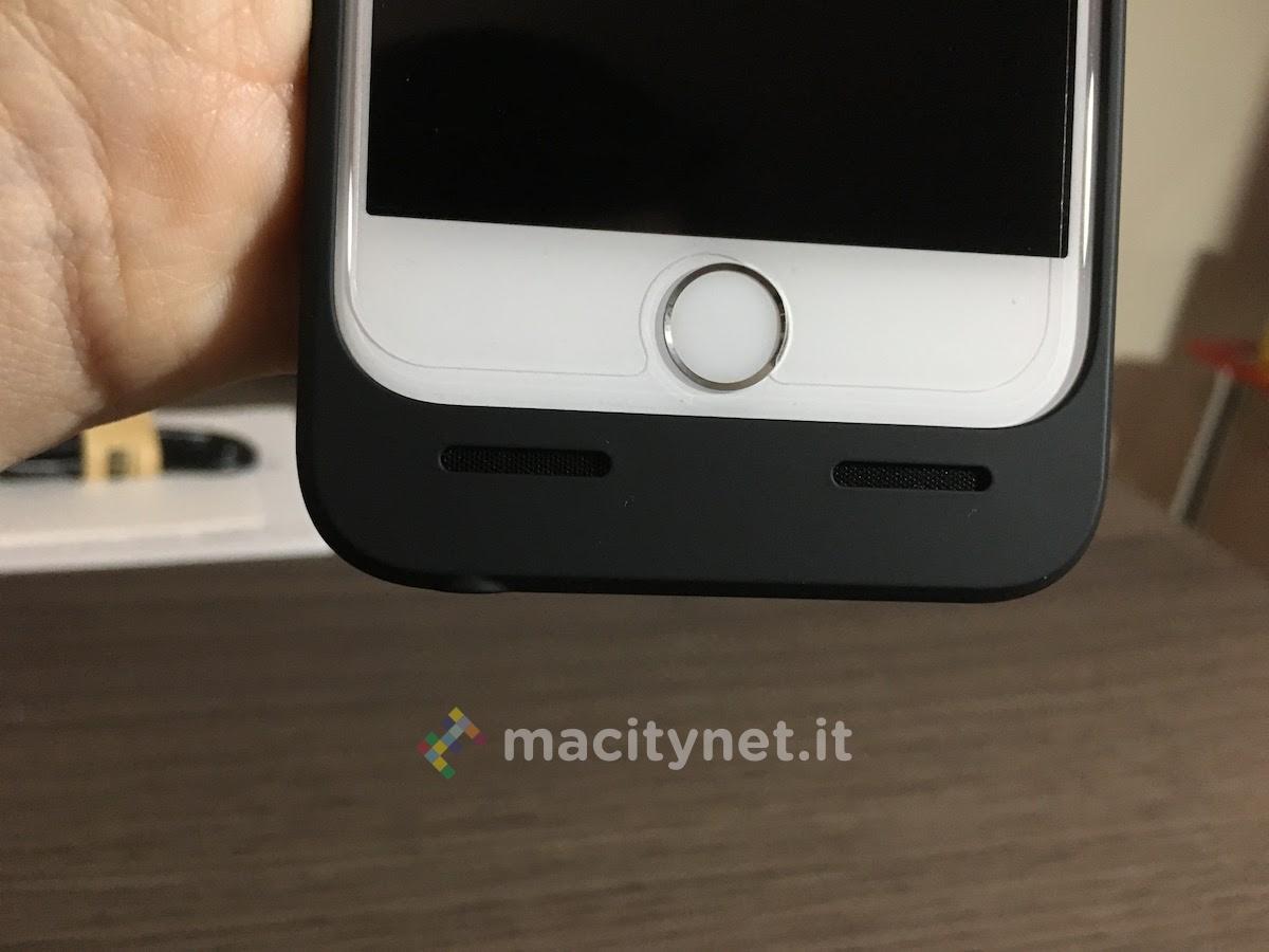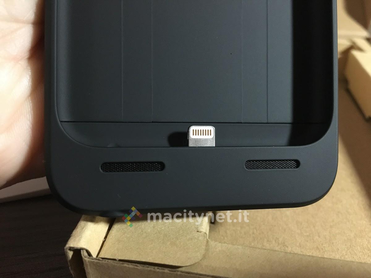 Nautalmente, la cover lascia intatte le funzioni dello smartphone, disponendo di tutte le aperture necessarie al corretto funzionamento. Su lato destro, in basso, si trova la presa per la ricarica MicroUSB, mentre per sincronizzare il dispositivo con PC o Mac sarà necessario estrarlo, per “liberare” la porta Lightning. Non sarà, invece, necessario, estrarlo dalla custodia per ricaricarlo, perché la porta Micro USB passa direttamente la corrente al telefono, per via del connettore Lightnig incluso. In pratica potremo caricare prima il telefono e poi la custodia batteria, semplicemente lasciandoli collegati ad un caricabatterie.