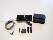 Le Creative Aurvana In-Ear3 Plus si presentano in una sorta di scatola-espositore, curata ed originale. Le cuffie sono sospese su un supporto trasparente e presentate come potrebbero esserlo in una boutique di dispositivi elettronici. Nella confezione troviamo, oltre alle cuffie, 4 paia di gommini, tre di silicone e uno di gommapiuma; questi ultimi sono del tutto originali e sono finalizzati a migliorare l’isolamento sonoro, di cui parleremo più avanti. Nella scatola è anche inclusa una custodia semirigida, con aletta magnetica, un adattatore per i sistemi audio degli aerei, e persino uno strumento per la pulizia delle auricolari. Insomma, una dotazione molto completa e inusuale anche per cuffie molto più costose.