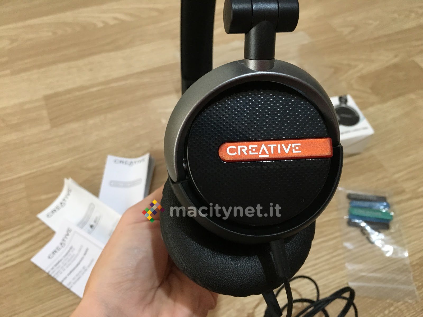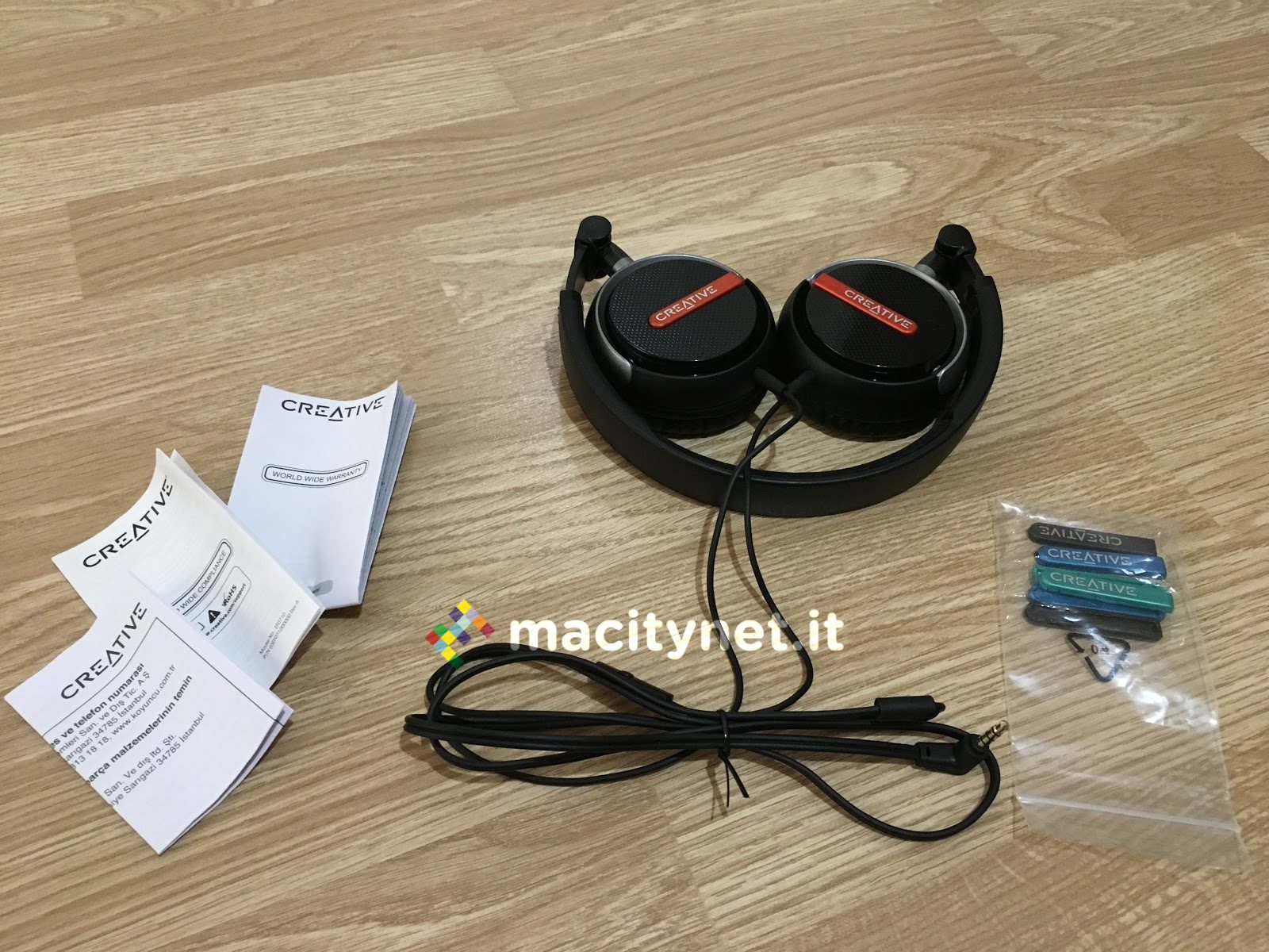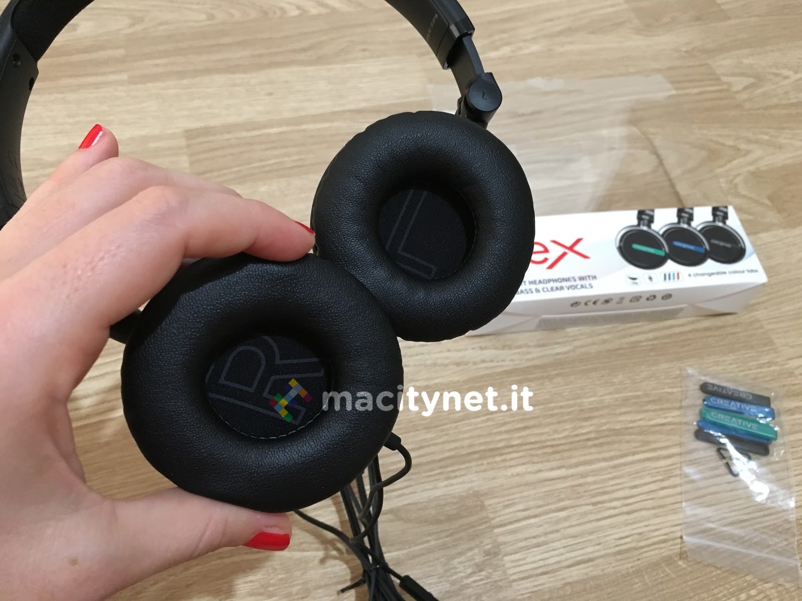 Il pack di vendita è completamente trasparente e lascia già intuire alcune delle caratteristiche estetiche di queste cuffie. Anzitutto il design, tradizionale, abbastanza sportivo, ma al tempo stesso elegante. Interamente nere, con un pattern leggermente in rilievo sui padiglioni auricolari esterni, presentano un unico tocco di colore nel piccolo inserto in plastica sul quale capeggia la scritta Creative. Gli inseriti colorati possono essere facilmente sfilati e sostituiti, grazie al fatto che la confezione include diverse plastiche: rosse, nere, blu e verdi. Un modo piuttosto semplice per cambiare leggermente look alle cuffie, per adattarle, magari, al modo di vestire, e ai colori che si indossano.