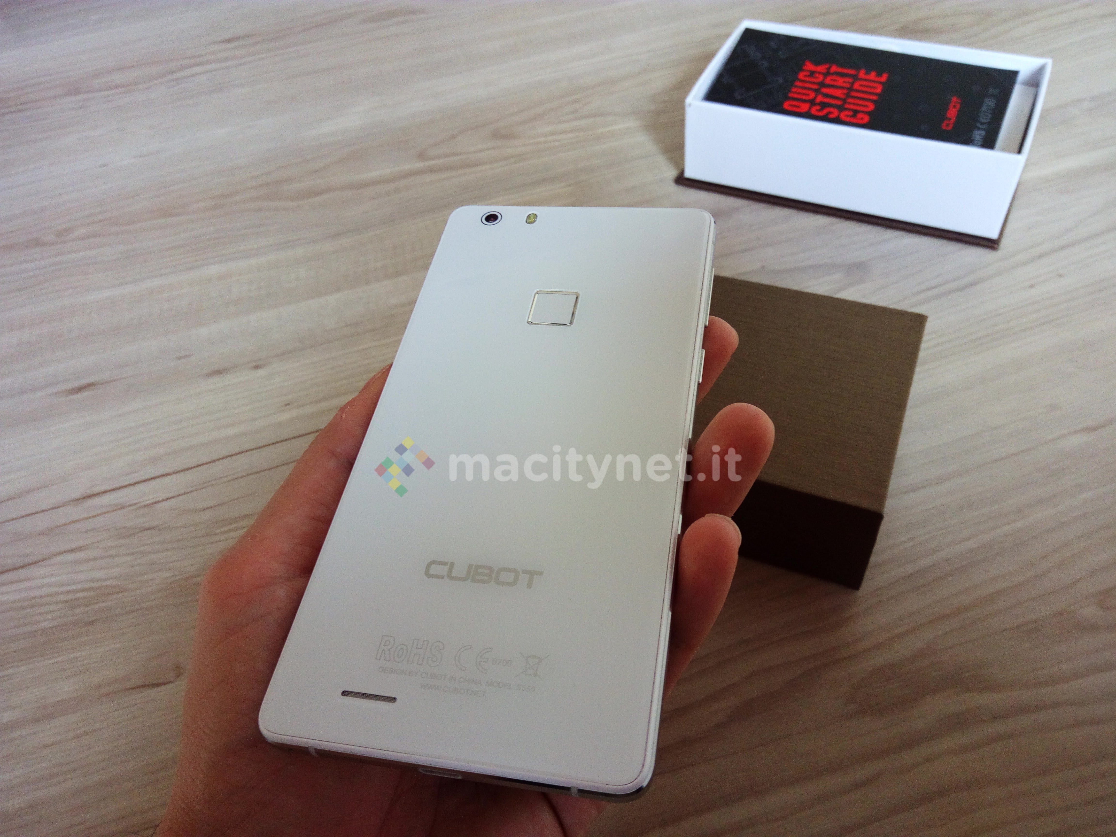 A differenziare Cubot S550 dal suo fratello minore X17 è la parte posteriore, completamente bianca, dove troviamo lettore di impronte digitali. Il materiale utilizzato sul retro è la plastica, ma il bianco lucido fa sembrare il dispositivo di alta qualità, forse più di quello che in realtà è. Si tiene bene in mano, al tatto è piacevole e per nulla scivoloso. Il sensore di impronte digitali, al di là del posizionamento posteriore, che può piacere o non piacere, non risulta estremamente preciso, con una percentuale di errore piuttosto evidente: insomma, non è la caratteristica su cui baseremmo un acquisto del dispositivo.
