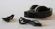 Le cuffie sono in plastica lucida, nulla di eccezionale ma comunque abbastanza solide da resistere a graffi e piccole sollecitazioni. Sono caratterizzate da un sistema che permette di ripiegare entrambi i padiglioni all’interno in modo da renderle più compatte e comode per il trasporto: sia l’aggancio che lo sgancio avviene attraverso una moderata pressione del padiglione verso l’interno o l’esterno a seconda dei casi ed è accompagnata da un “clack” ben udibile che, almeno le prime volte, da l’impressione di aver rotto qualcosa. In realtà è proprio la caratteristica del sistema che mantiene saldo il giunto. Oltre a poter essere ripiegato, ciascun padiglione può essere anche allungato di ulteriori 2,7 centimetri per potersi adattare a qualsiasi conformazione: la parte superiore, quella che entra a contatto con la nostra testa e che sostiene le cuffie, è imbottita in gommapiuma rivestita in ecopelle, aumentando il confort durante il prolungato utilizzo.