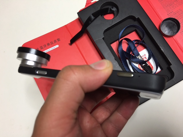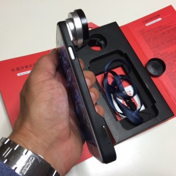 La parte ottica è piuttosto massiccia e molto robusta, una sorpresa per chi è abituato ad altre lenti simili realizzate, spesso, in “plastica su plastica”. Si tratta di un blocco in alluminio con montata una lente in vetro che si va ad avvitare sulla custodia stessa. Viene fornita anche con una copertura della lente. Oltre a questo la custodia, come accennato, è più spessa nella parte inferiore. Qui troveremo infatti una batteria e un tasto Bluetooth che serve come pulsante di scatto delle foto. La base larga permette anche di tenere in orizzontale, appoggiata su un piano, la custodia con al suo interno il telefono, questo per un autoscatto o, eventualmente, per una foto che non risulti mossa.