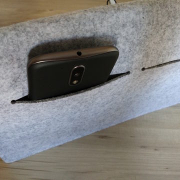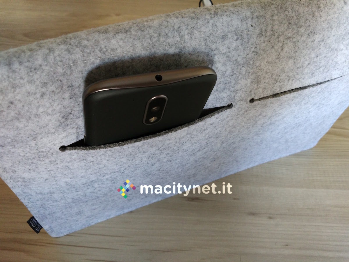 L’estetica delle due svleeve è pressoché identica, minimale e particolarmente pulita. Entrambe sono rivestite esteriormente in feltro, mentre all’interno è presente il camoscio, che permette di evitare graffi quando il terminale viene adagiato nelle rispettive tasche. In effetti, non abbiamo riscontrato alcun problema utilizzando quotidianamente la sleeve, e anche il nostro iPad, riposto nell’apposita tasca più piccola, non ha mai subito graffi allo schermo. Il porta Nootebook Dodocool, oltre alle due tasche frontali, utili per riporre notebook e tablet, presenta anche due tasche posteriori, utili per riporre strumenti di cancelleria, come ad esempio penne, ma che possono anche ospitare due smartphone, anche se non completamente. Come si vede in foto, infatti, lo scmartphone viene accolto per vie verticali solo per la meta circa.