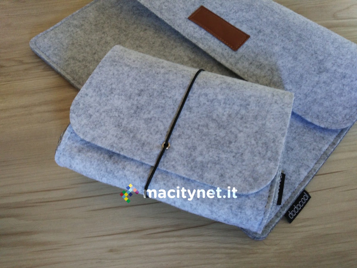 Sia la sleeve per Macbook che la pochette per eventuali accessori sono realizzate in feltro sintetico, con coloraziona completamente grigia. Le dimensioni esterne della sleeve sono di circa 33,50 x 23.50 x 1.00 cm, mentre lo spazio interno apprezzabile ammonta a circa 32.50 x 22.00 x 1.00 cm cm. Questo vuol dire che il piccolo sacchetto può ospitare in comodità un Macbook 12 pollici, o un qualsiasi notebook di simili dimensioni, purché abbastanza sottili, come i modelli della gamma air o i Surface di Microsoft. Le dimensioni interne della pochette, invece, sono di circa 16.00 x 11.50 x 3.20 cm, quindi più che sufficienti per un mouse di qualsiasi dimensioni o altri accessori, come router portatili, SD, e altro ancora.