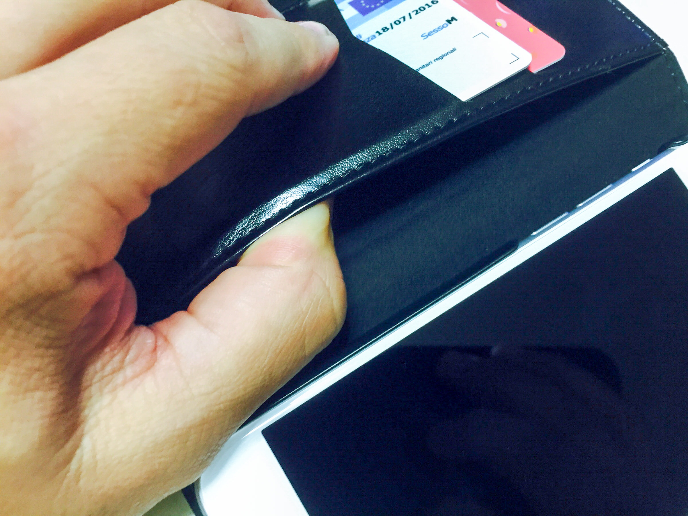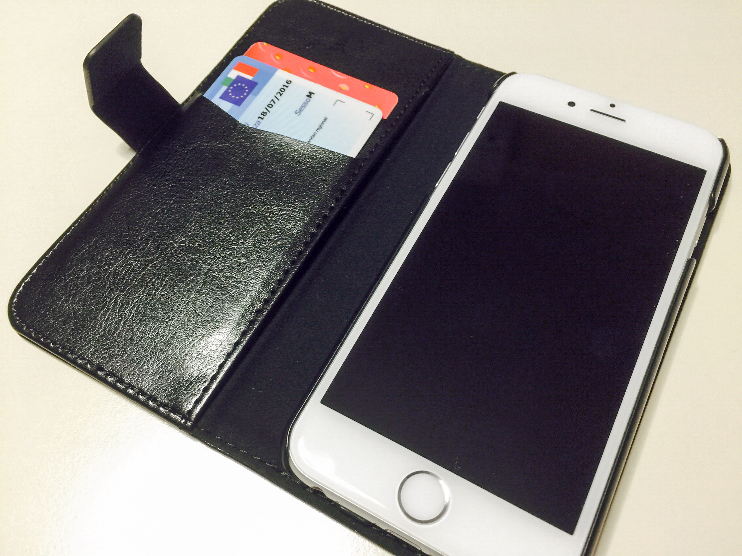 Segnaliamo che fin dall’unboxing le custodie non emanano l’odore di plastica che hanno altri prodotti simili, una caratteristica da non sottovalutare in quanto non è comune in prodotti della stessa fascia di prezzo. Quando chiusa con l’iPhone la custodia ci dà l’impressione di essere robusta, le finiture sono di fascia superiore se consideriamo il prezzo con il quale sono vendute: l’interno ad esempio è caratterizzato da un doppio rivestimento con rinforzo in tessuto di nylon, perfetto per ammortizzare l’urto di un’eventuale caduta. All’interno della copertina troviamo due tasche per carte di credito, ed una laterale più grande per scontrini e banconote: quest’ultima è sottile, ma piuttosto funzionale se la quantità di cose da infilare è poca.