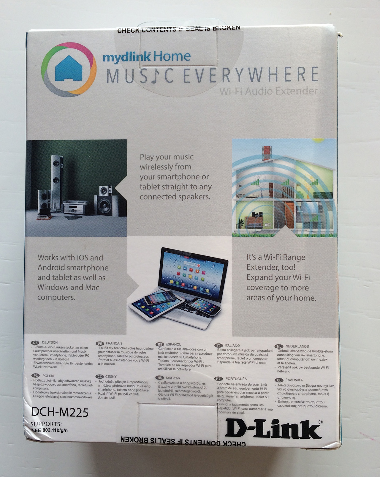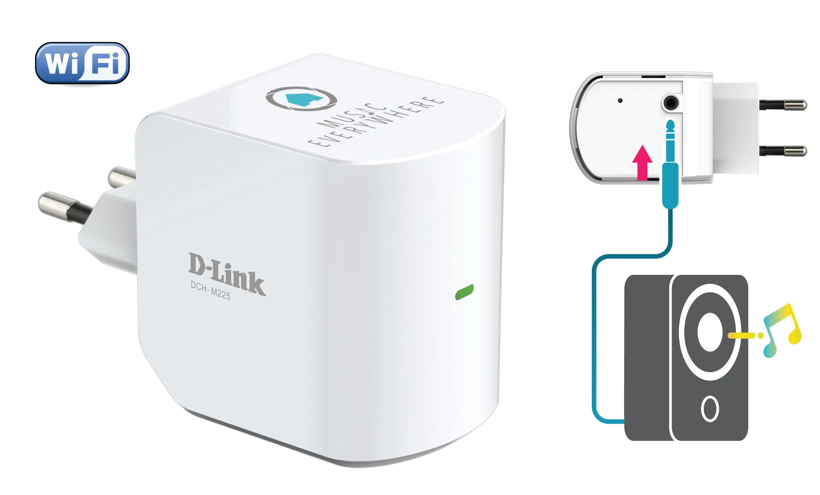 dlink-Music-Everywhere1Music Everywhere DCH M225, questa la sigla del prodotto, è stato presentato qualche settimana fa nell’ambito dei dispositivi MyDlink Home ma è un dispositivo che vive una vita a parte, scollegata da un progetto globale per la domotica, occupandosi specificamente di estendere una rete domestica attraverso WPS o una configurazione manuale e di portare a nuova vita un impianto audio senza collegamento Wireless.